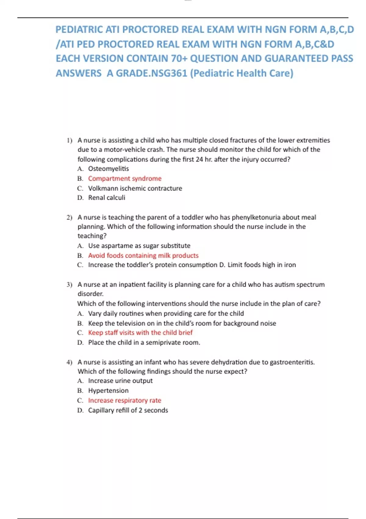 PEDIATRIC ATI PROCTORED REAL EXAM WITH NGN FORM A,B,C,D /ATI PED PROCTORED REAL EXAM WITH NGN FORM A,B,C&D EACH VERSION CONTAIN 70+ QUESTION AND GUARANTEED PASS ANSWERS A GRADE.NSG361 (Pediatric Health Care)