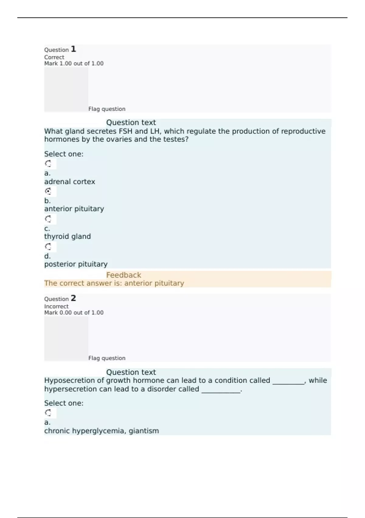 What gland secretes FSH and LH, which regulate the production of reproductive hormones by the ovaries and the testes? Select one: a. adrenal cortex b. anterior pituitary c. thyroid gland d. posterior pituitary Feedback The correct answer is: anterior pituitary Question 2 Incorrect Mark 0.00 out of 1.00 Flag question Question text Hyposecretion of growth hormone can lead to a condition called _________, while hypersecretion can lead to a disorder called ___________. Select one: a. chronic hyperglycemia, giantism