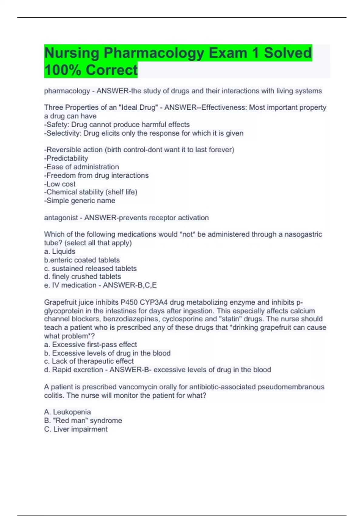 pharmacology - ANSWER-the study of drugs and their interactions with living systems Three Properties of an "Ideal Drug" - ANSWER--Effectiveness: Most important property a drug can have -Safety: Drug cannot produce harmful effects -Selectivity: Drug elicits only the response for which it is given -Reversible action (birth control-dont want it to last forever) -Predictability -Ease of administration -Freedom from drug interactions -Low cost -Chemical stability (shelf life) -Simple generic name antagonist - ANSWER-prevents receptor activation Which of the following medications would *not* be administered through a nasogastric tube? (select all that apply) a. Liquids ic coated tablets c. sustained released tablets d. finely crushed tablets e. IV medication - ANSWER-B,C,E Grapefruit juice inhibits P450 CYP3A4 drug metabolizing enzyme and inhibits p-glycoprotein in the intestines for days after ingestion. This especially affects calcium channel blockers, benzodiazepines, cyclosporine and "statin" drugs. The nurse should teach a patient who is prescribed any of these drugs that *drinking grapefruit can cause what problem*? a. Excessive first-pass effect b. Excessive levels of drug in the blood c. Lack of therapeutic effect d. Rapid excretion - ANSWER-B- excessive levels of drug in the blood A patient is prescribed vancomycin orally for antibiotic-associated pseudomembranous colitis. The nurse will monitor the patient for what? A. Leukopenia B. "Red man" syndrome C. Liver impairment