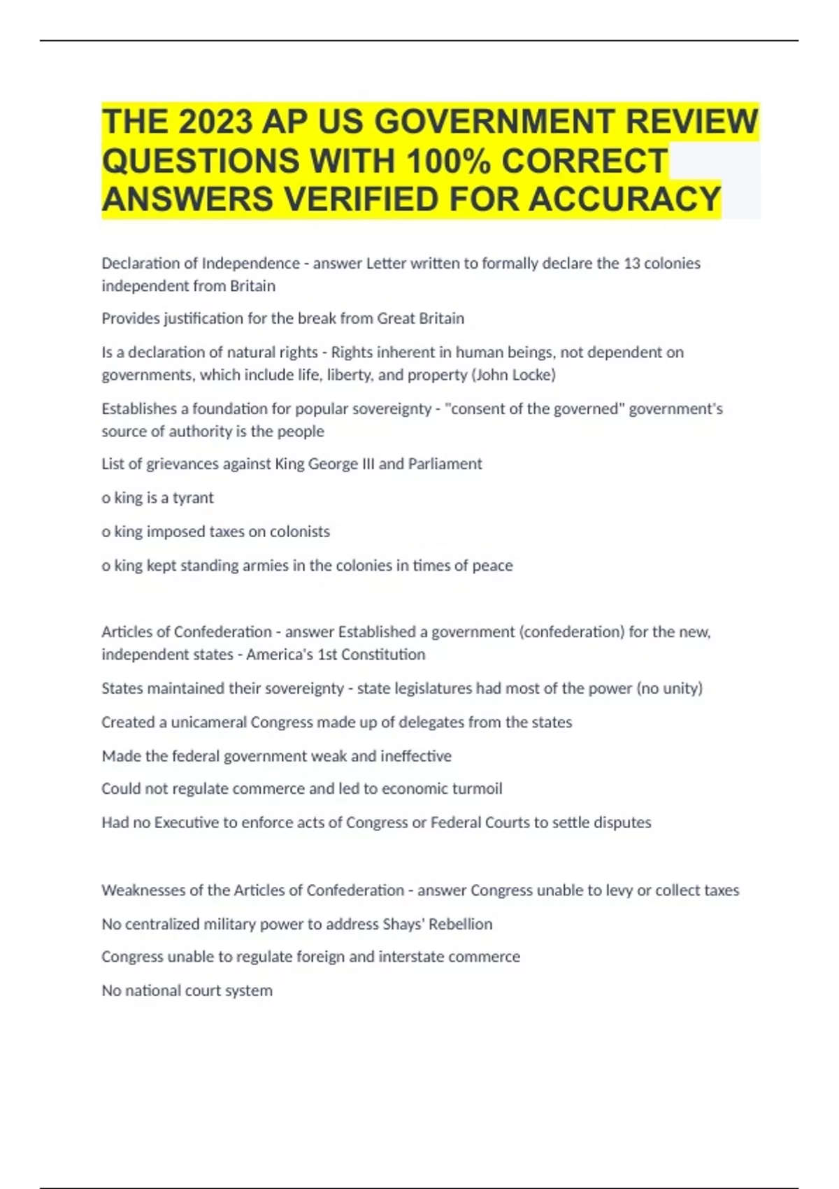 THE 2023 AP US GOVERNMENT REVIEW QUESTIONS WITH 100% CORRECT ANSWERS