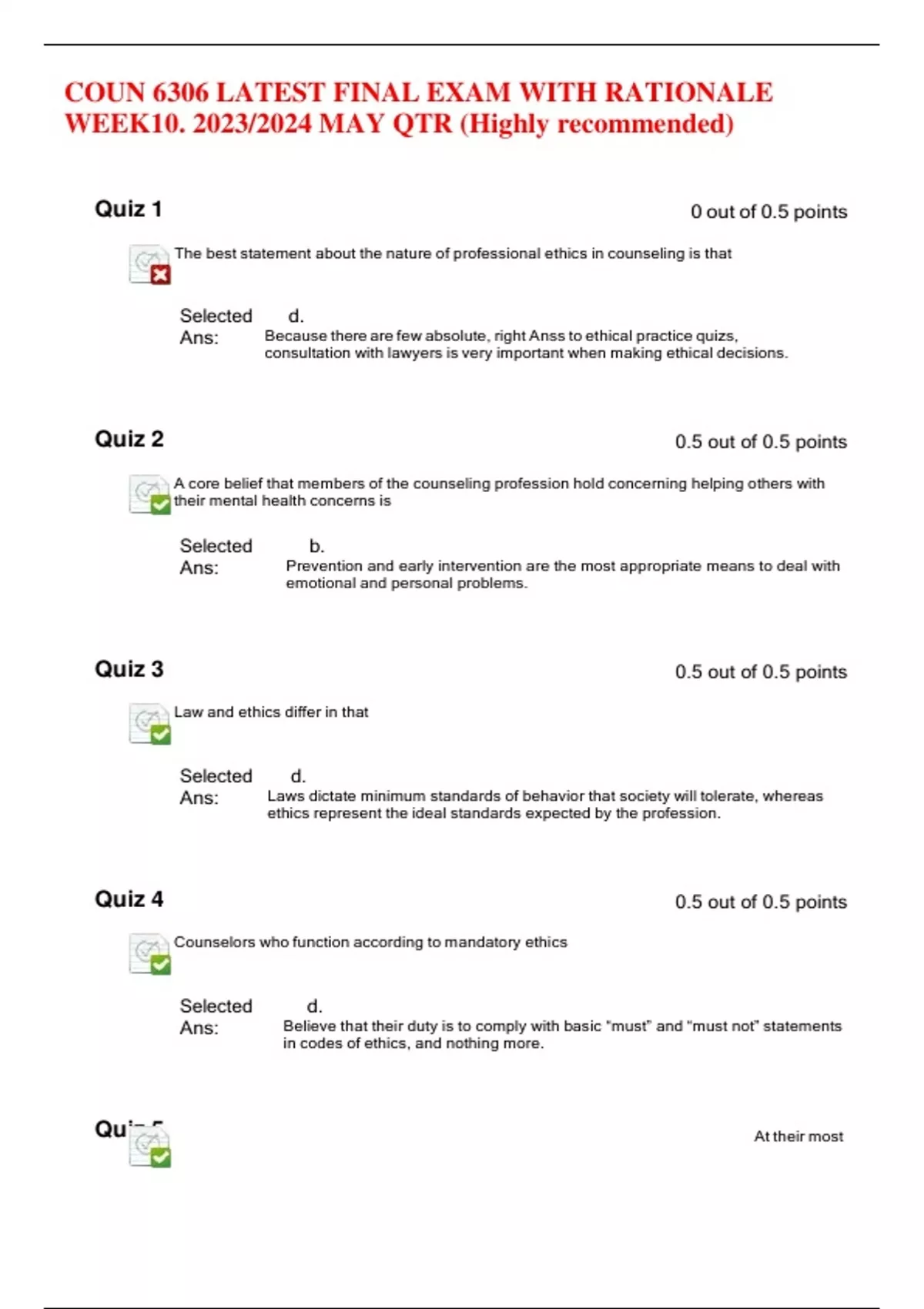 COUN 6306 LATEST FINAL EXAM WITH RATIONALE WEEK10. 2023/2024 MAY QTR (Highly recommended) Quiz 1 0 out of 0.5 points The best statement about the nature of professional ethics in counseling is that Selected Ans: d. Because there are few absolute, right Anss to ethical practice quizs, consultation with lawyers is very important when making ethical decisions. Quiz 2 0.5 out of 0.5 points A core belief that members of the counseling profession hold concerning helping others with their mental health concerns is Selected Ans: b. Prevention and early intervention