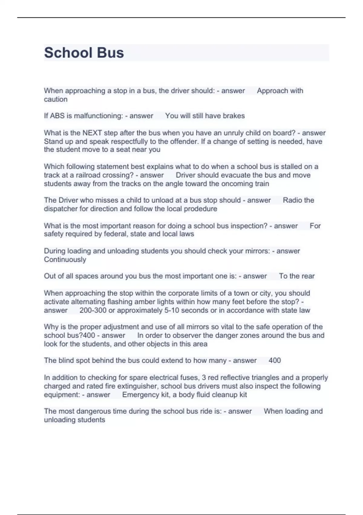 School Bus Questions with correct Answers 2023