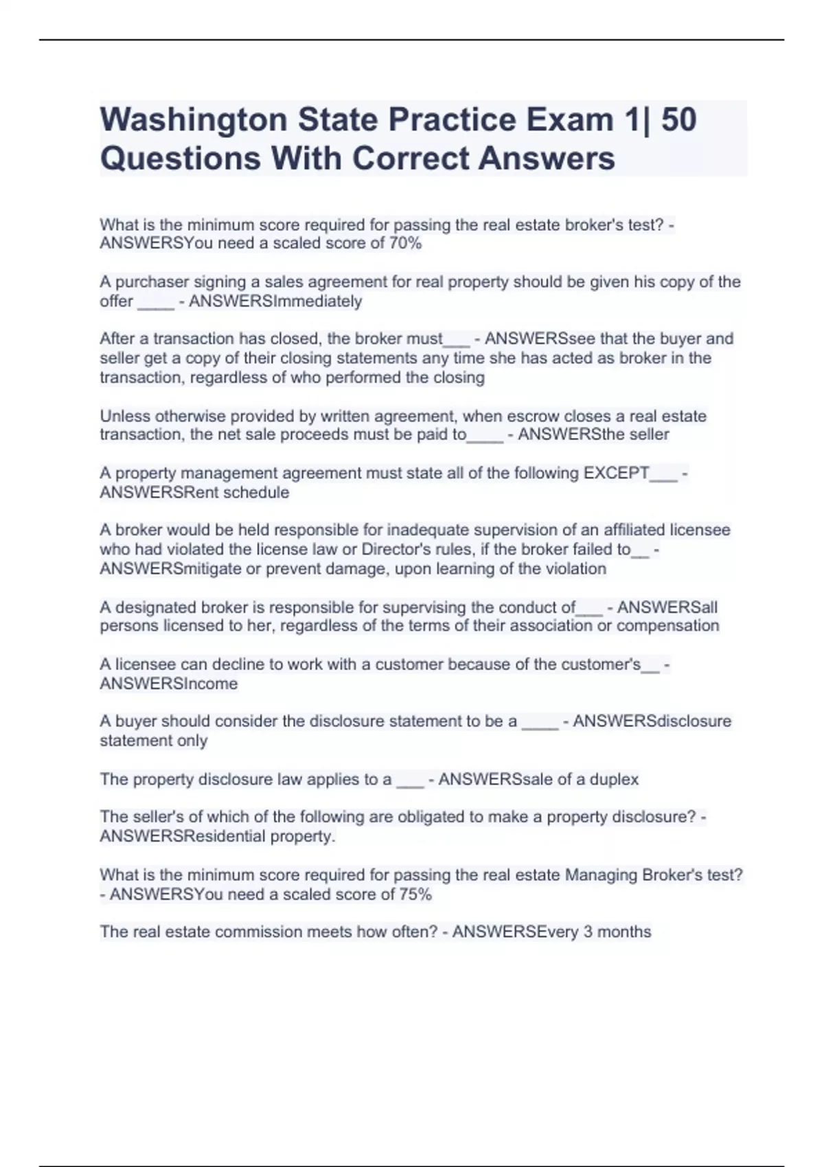 What is the minimum score required for passing the real estate broker's test? - ANSWERSYou need a scaled score of 70% A purchaser signing a sales agreement for real property should be given his copy of the offer ____ - ANSWERSImmediately After a transaction has closed, the broker must___ - ANSWERSsee that the buyer and seller get a copy of their closing statements any time she has acted as broker in the transaction, regardless of who performed the closing Unless otherwise provided by written agreement, when escrow closes a real estate transaction, the net sale proceeds must be paid to____ - ANSWERSthe seller A property management agreement must state all of the following EXCEPT___ - ANSWERSRent schedule A broker would be held responsible for inadequate supervision of an affiliated licensee who had violated the license law or Director's rules, if the broker failed to__ - ANSWERSmitigate or prevent damage, upon learning of the violation A designated broker is responsible for supervising the conduct of___ - ANSWERSall persons licensed to her, regardless of the terms of their association or compensation Washington State Practice Exam 1| 50 Questions With Correct Answers