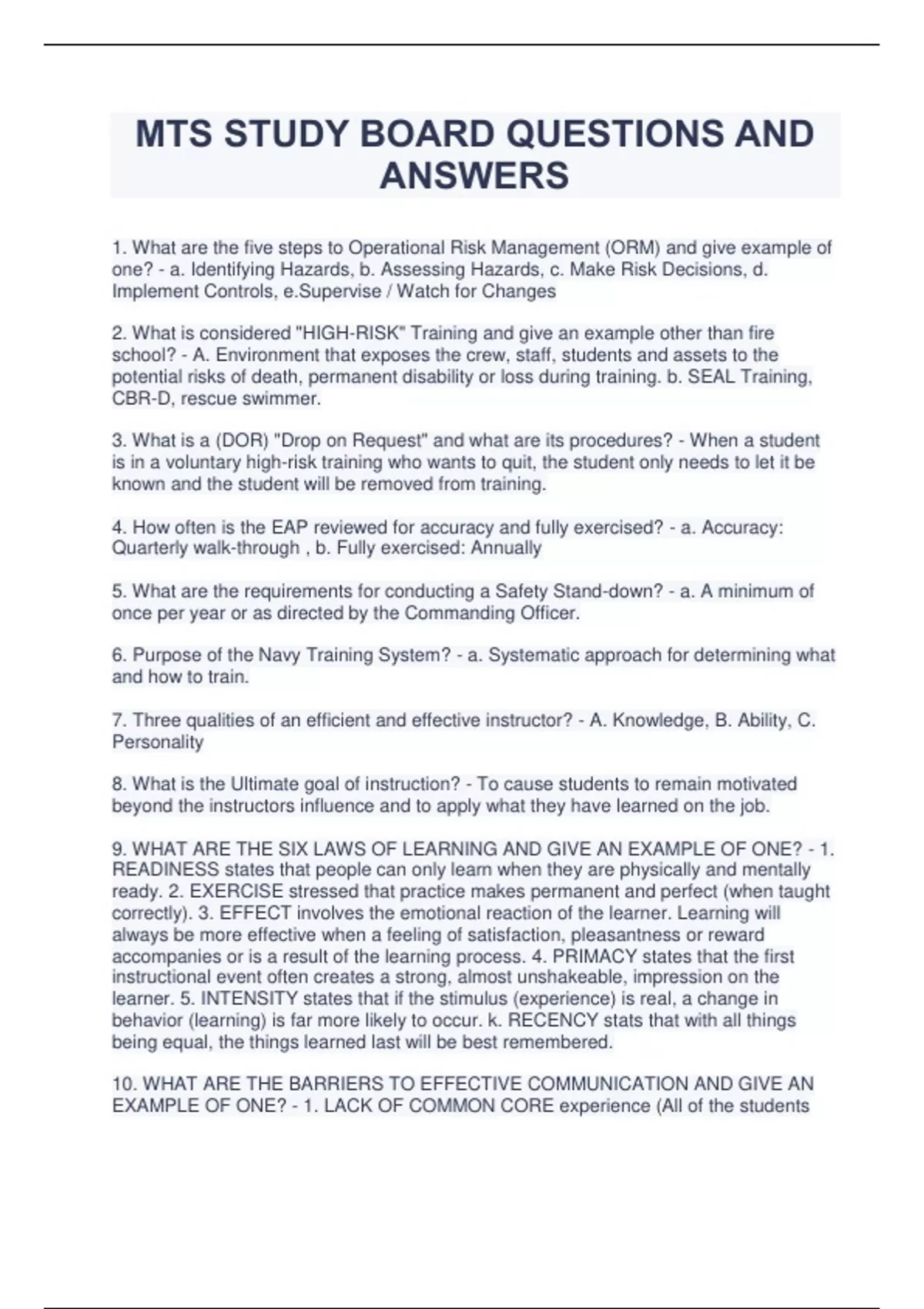 MTS STUDY BOARD QUESTIONS AND ANSWERS