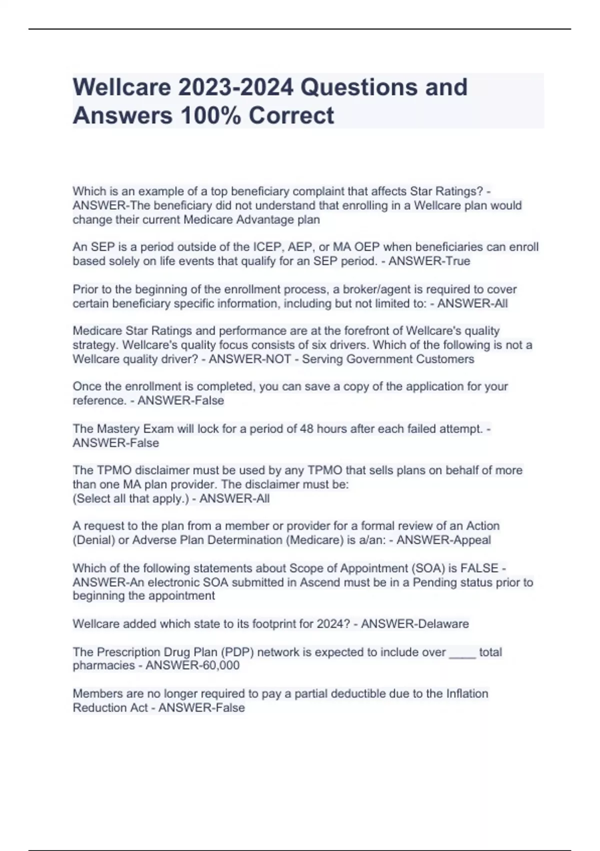 Wellcare Questions and Answers 100% Correct Wellcare Questions and Answers 100% Correct Wellcare Questions and Answers 100% Correct Which is an example of a top beneficiary complaint that affects Star Ratings? - ANSWER-The beneficiary did not understand that enrolling in a Wellcare plan would change their current Medicare Advantage plan An SEP is a period outside of the ICEP, AEP, or MA OEP when beneficiaries can enroll based solely on life events that qualify for an SEP period. - ANSWER-True