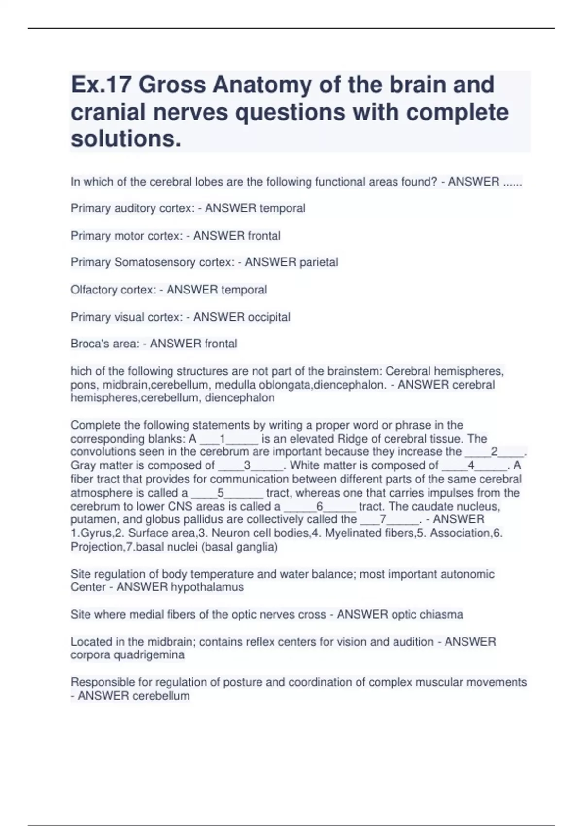 Ex.17 Gross Anatomy of the brain and cranial nerves questions with complete solutions.