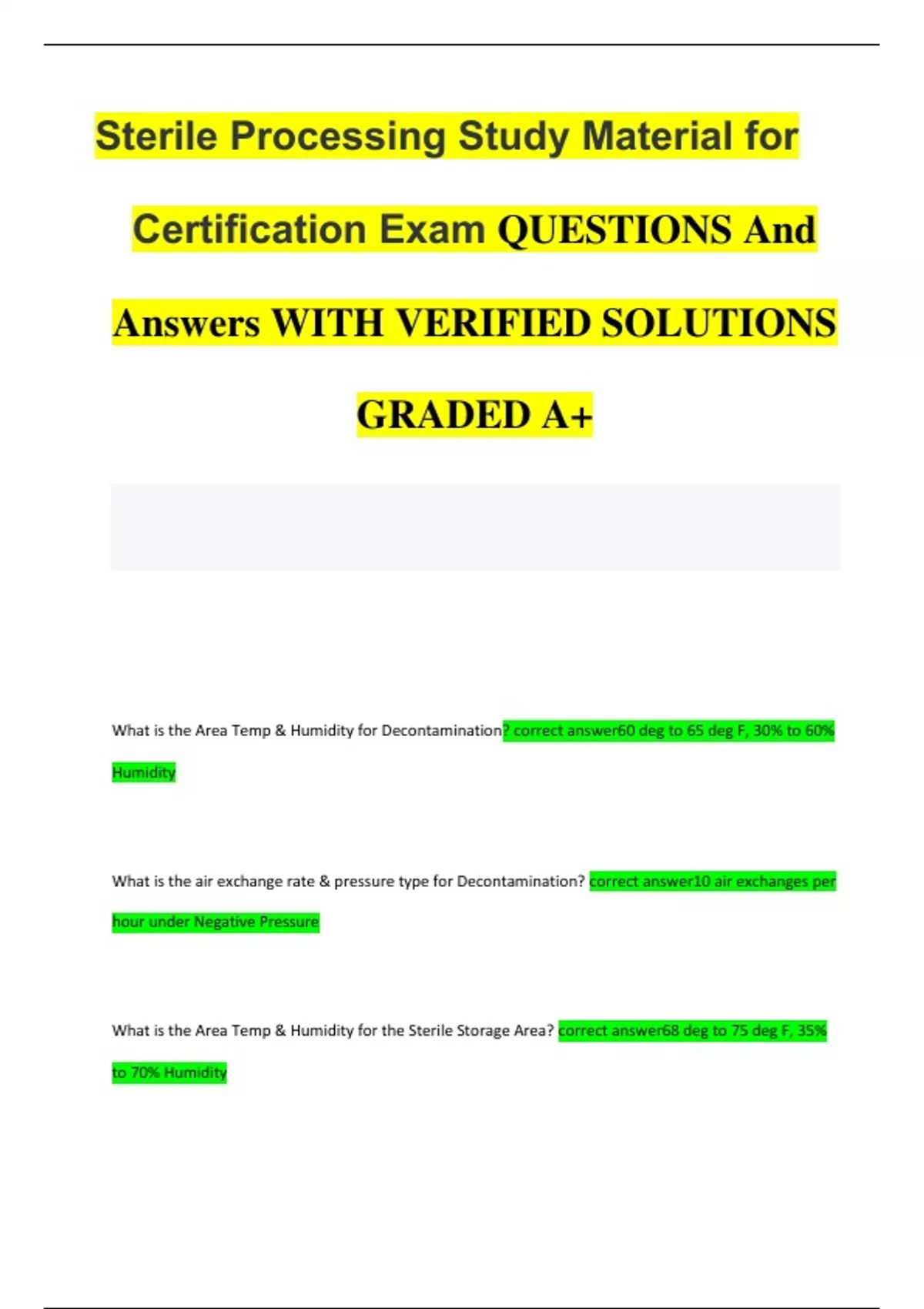 Sterile Processing Study Material for Certification Exam QUESTIONS And Answers WITH VERIFIED SOLUTIONS GRADED A+ What is the Area Temp & Humidity for Decontamination? correct answer60 deg to 65 deg F, 30% to 60% Humidity What is the air exchange rate & pressure type for Decontamination? correct answer10 air exchanges per hour under Negative Pressure What is the Area Temp & Humidity for the Sterile Storage Area? correct answer68 deg to 75 deg F, 35% to 70% Humidity What is the Area Temp & Humidity for the Prep & Packaging Area? correct answer68 deg to 73 deg F, Ideal Humidity 50% - not lower than 35% The main role of sterile processing is to: correct answerProvide dependable reliable services to enhance the quality of patient care. Ethics is the practice of: correct answerDoing the right thing. Which of the following establishes sterilization practice standards based on opinion, research, and/or theory: correct answerAAMI EPA, FDA, OSHA and state departments of health (DOH) primarily issue: correct answerRegulations. Standards for CS/SPD practice are written by: correct answerAAMI The Health Insurance Portability and Accountability Act provides for which ethical issue? correct answerConfidentiality If healthcare facilities reprocess single-use devices, the devices must be cleared by: correct answerFDA