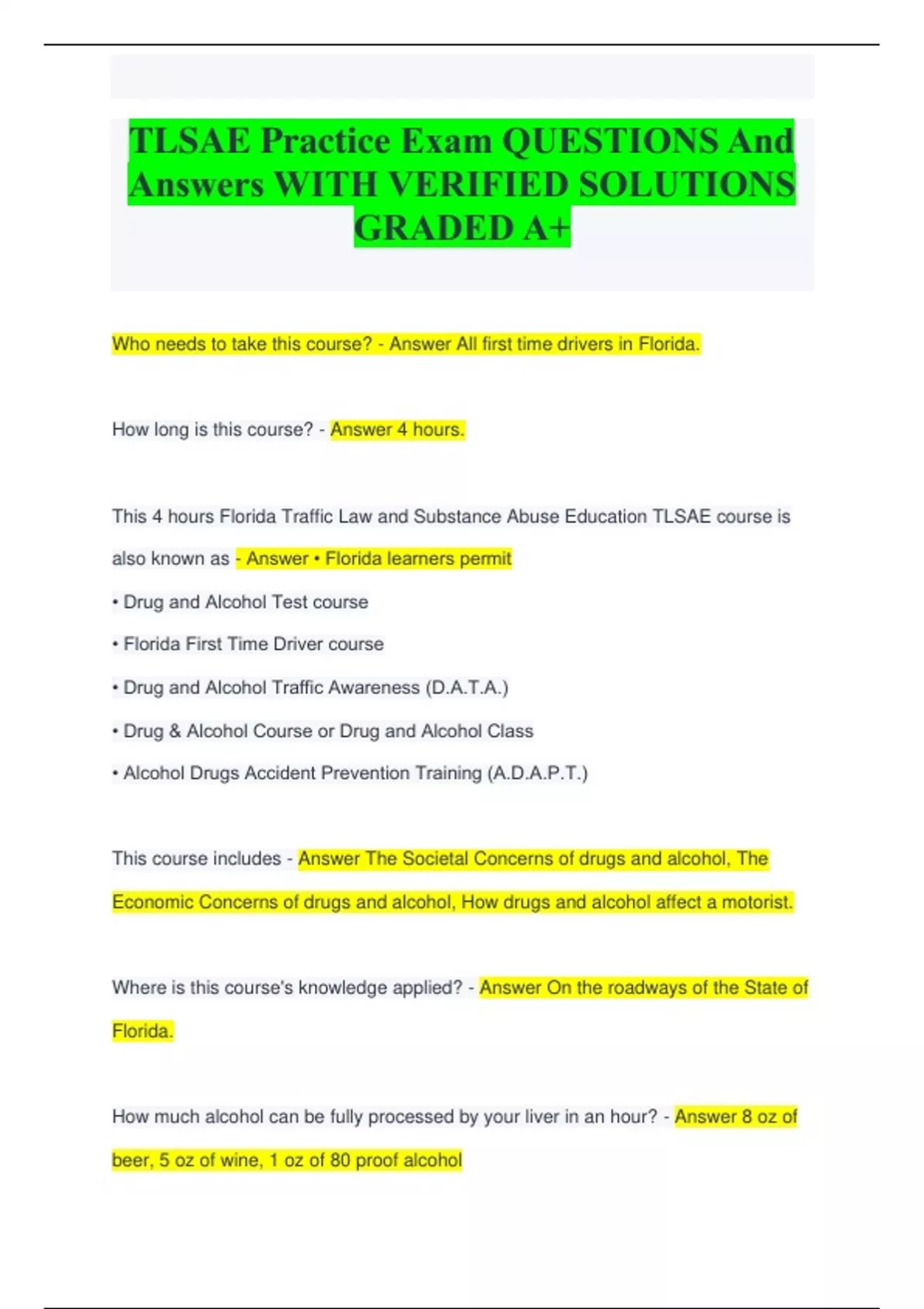 TLSAE Practice Exam QUESTIONS And Answers WITH VERIFIED SOLUTIONS GRADED A+ Who needs to take this course? - Answer All first time drivers in Florida. How long is this course? - Answer 4 hours. This 4 hours Florida Traffic Law and Substance Abuse Education TLSAE course is also known as - Answer • Florida learners permit • Drug and Alcohol Test course • Florida First Time Driver course • Drug and Alcohol Traffic Awareness (D.A.T.A.) • Drug & Alcohol Course or Drug and Alcohol Class • Alcohol Drugs Accident Prevention Training (A.D.A.P.T.) This course includes - Answer The Societal Concerns of drugs and alcohol, The Economic Concerns of drugs and alcohol, How drugs and alcohol affect a motorist. Where is this course's knowledge applied? - Answer On the roadways of the State of Florida. How much alcohol can be fully processed by your liver in an hour? - Answer 8 oz of beer, 5 oz of wine, 1 oz of 80 proof alcohol