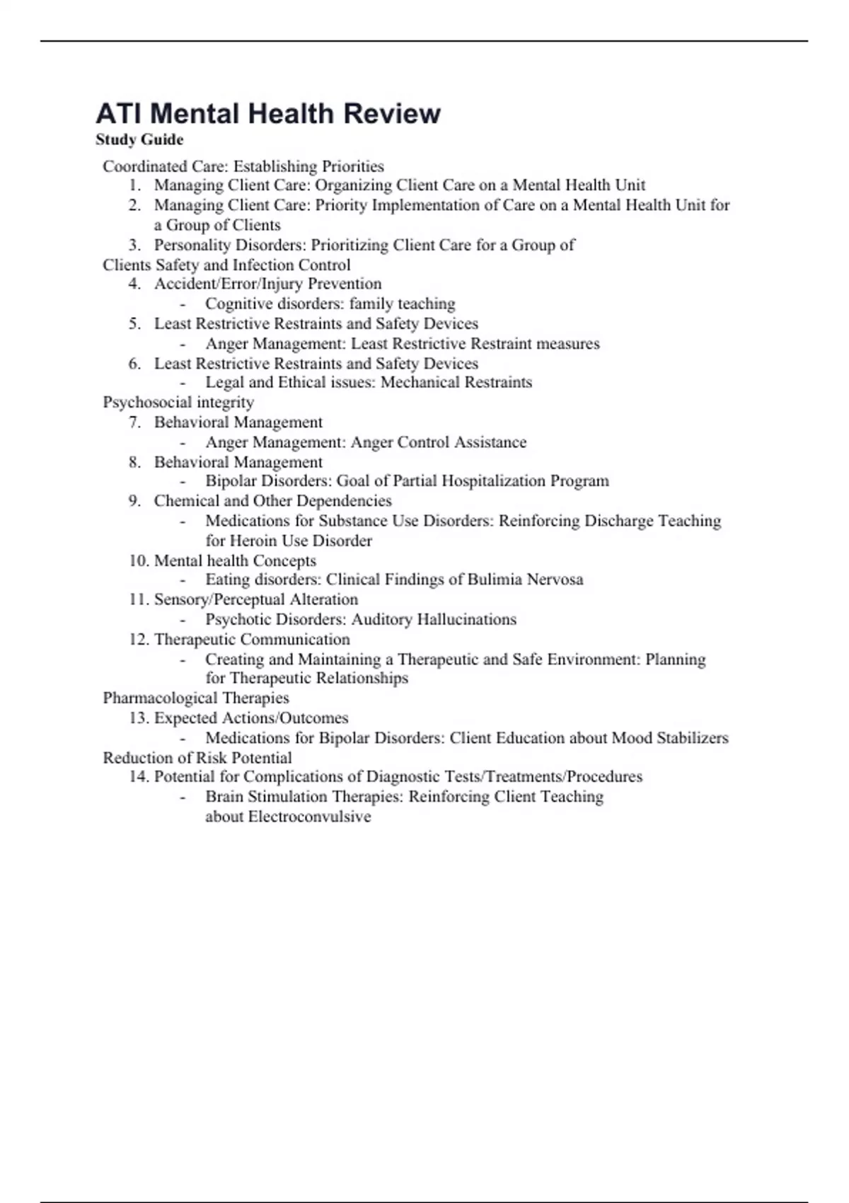 ATI Mental Health Review Study Guide Coordinated Care: Establishing Priorities 1. Managing Client Care: Organizing Client Care on a Mental Health Unit 2. Managing Client Care: Priority Implementation of Care on a Mental Health Unit for a Group of Clients 3. Personality Disorders: Prioritizing Client Care for a Group of Clients Safety and Infection Control 4. Accident/Error/Injury Prevention - Cognitive disorders: family teaching 5. Least Restrictive Restraints and Safety Devices - Anger Management: Least Restrictive Restraint measures 6. Least Restrictive Restraints and Safety Devices - Legal and Ethical issues: Mechanical Restraints Psychosocial integrity 7. Behavioral Management - Anger Management: Anger Control Assistance 8. Behavioral Management - Bipolar Disorders: Goal of Partial Hospitalization Program 9. Chemical and Other Dependencies - Medications for Substance Use Disorders: Reinforcing Discharge Teaching for Heroin Use Disorder 10. Mental health Concepts - Eating disorders: Clinical Findings of Bulimia Nervosa 11. Sensory/Perceptual Alteration - Psychotic Disorders: Auditory Hallucinations 12. Therapeutic Communication - Creating and Maintaining a Therapeutic and Safe Environment: Planning for Therapeutic Relationships Pharmacological Therapies 13. Expected Actions/Outcomes - Medications for Bipolar Disorders: Client Education about Mood Stabilizers Reduction of Risk Potential 14. Potential for Complications of Diagnostic Tests/Treatments/Procedures - Brain Stimulation Therapies: Reinforcing Client Teaching about Electroconvulsive 1. Coordinated Care: Establishing Priorities Managing Client Care: Organizing Client Care on a Mental Health Unit - Clinical reasoning guides the nurse through the process of assessing and compiling data o Nurse must assess first - Prioritize actual problems before potential future problems - One way to set priorities is based upon Maslow’s hierarchy of needs o Focus on physiological (such as food etc) before other needs ▪ Ex: offer high caloric fluids to prevent dehydration and exhaustion **In this question, the nurse prioritized care and chose to first offer high caloric fluids to a constantly pacing client. Other options were a helping a client with anxiety disorder practice relaxation technique, assisting a client w/ a decision re: group activities, or encouraging a client to verbalize feelings of hopelessness. 2. Coordinated Care: Establishing Priorities Managing Client Care: Priority Implementation of Care on a Mental Health Unit for a Group of Clients - When providing care, the nurse should select interventions that are the least restrictive/invasive first. - Use the nursing process to gather information prior to making a decision regarding a plan of action. - Apply clinical knowledge to procedural standards to determine the priority action **In this question, the nurse would have offered the client with dementia, who was increasing agitated, a diversionary activity rather than placing the client in a private room (even though it decreases environmental stimuli and escalation, it’s still shutting them in and that could be restrictive). 3. Coordinated Care: Establishing Priorities Personality Disorders: Prioritizing Client Care for a Group of Clients - Limit-setting and consistency are essential with clients who are manipulative, especially those who have borderline or antisocial personality disorders - Safety is always a priority concern because some clients who have a personality disorder are at risk for self-injury or violence o Give priority to responding to whatever poses the greatest (or most imminent) risk to the client’s physical well-being or that of others. - Characterized by disregard for others with exploitation, repeated unlawful actions, deceit, and failure to accept personal responsibility **In this question, we would have addressed the client with antisocial personality disorder first because his irrational actions could have caused harm to himself or others. 4. Safety and Infection Control Accident/Error/Injury Prevention: Cognitive Disorders: Family Teaching - Nocturnal confusion places the client at greatest risk for injury due to falls and wandering, the nurse should report this to the provider. - Level of consciousness is usually unchanged - Impairments in memory, judgement, speech (aphasia), ability to recognize familiar objects (agnosia), executive functioning (ADLs), and movement (apraxia) do not change throughout the day. Personality changes are gradual. **In this question, the nurse should bring nocturnal confusion to the provider’s attention rather than a demand for constant attention, or personality changes. The others are concerning, but the confusion holds the greatest potential for injury to the client. 5. Safety and Infection Control Least Restrictive Restraints and Safety Devices Anger Management: Least Restrictive Restraint Measures - Seclusion and restraint do not usually lead to positive behavior changes. Seclusion and restraint may keep individuals safe during a violent outburst, but the use of the restraint itself can be dangerous and has, on rare occasions, led to the death of clients due to reasons such as suffocation and strangulation. - When deemed essential to use restraints, remove the client from seclusion or restraint as soon as the crisis is over and when the client attempts reconciliation and is no longer aggressive. - Discuss ways for the client to keep control during the aggression cycle. 6. Safety and Infection Control Least Restrictive Restraints and Safety Devices Legal and Ethical Issues: Mechanical Restraints - When all other avenues have been exhausted, the following must happen in order for the restraint to be used: o Treatment must be ordered by the primary care provider in writing ▪ In emergency situations, the nurse may apply w/o first obtaining the provider’s written order, but it usually must be obtained within 15-30 min. o Order must specify the duration of treatment 