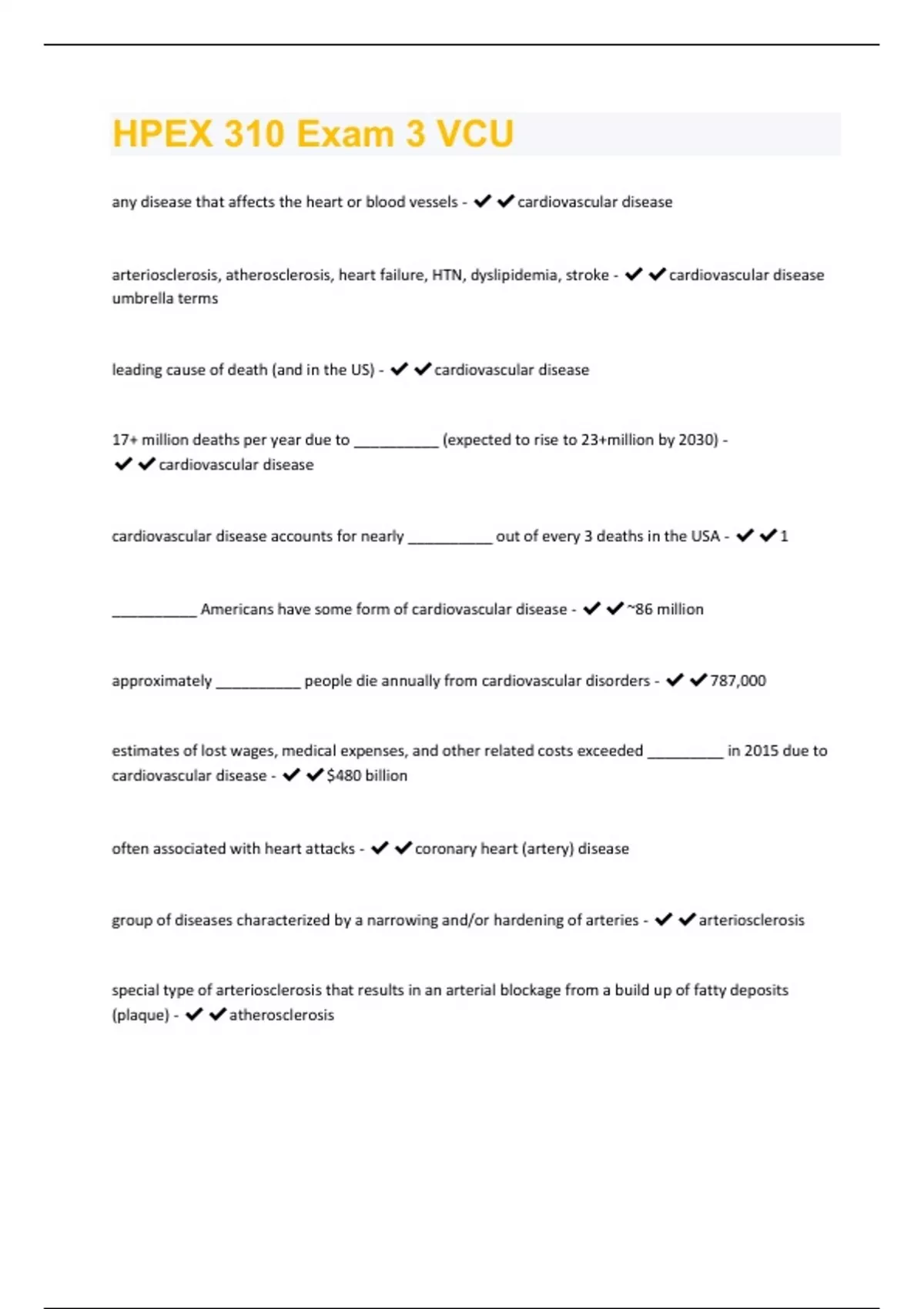 any disease that affects the heart or blood vessels -cardiovascular disease arteriosclerosis, atherosclerosis, heart failure, HTN, dyslipidemia, stroke - cardiovascular disease umbrella terms leading cause of death (and in the US) - cardiovascular disease 17+ million deaths per year due to __________ (expected to rise to 23+million by 2030) - cardiovascular disease cardiovascular disease accounts for nearly __________ out of every 3 deaths in the USA - 1 __________ Americans have some form of cardiovascular disease - ~86 million approximately __________ people die annually from cardiovascular disorders - 787,000 estimates of lost wages, medical expenses, and other related costs exceeded _________ in 2015 due to cardiovascular disease -$480 billion often associated with heart attacks - coronary heart (artery) disease group of diseases characterized by a narrowing and/or hardening of arteries - arteriosclerosis special type of arteriosclerosis that results in an arterial blockage from a build up of fatty deposits (plaque) - atherosclerosisrupture or progression of __________ (plaque) decreases blood flow and results in tissue death - atherosclerosis rupture or progression of atherosclerosis (plaque) decreases __________ and results in tissue death - blood flow rupture or progression of atherosclerosis (plaque) decreases blood flow and results in tissue death! it can also lead to a heart attack, __________, or pulmonary embolism - stroke
