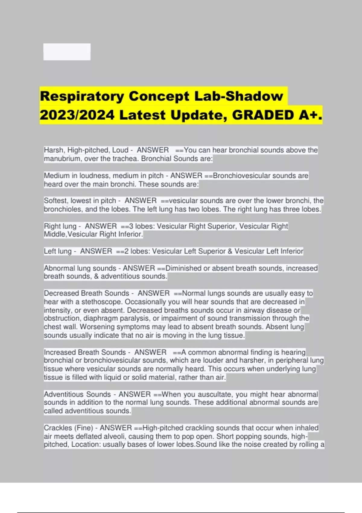 Respiratory Concept Lab-Shadow 2023/2024 Latest Update, GRADED A+.