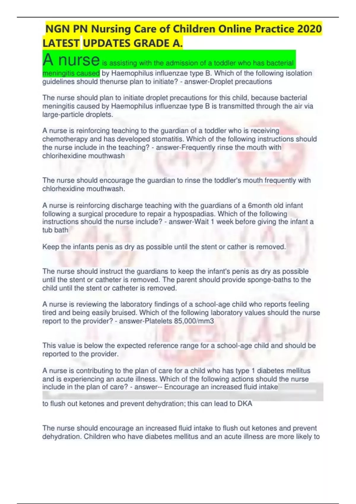 NGN PN Nursing Care of Children Online Practice 2020 LATEST UPDATES GRADE A. A nurseis assisting with the admission of a toddler who has bacterial meningitis caused by Haemophilus influenzae type B. Which of the following isolation guidelines should thenurse plan to initiate? - answer-Droplet precautions The nurse should plan to initiate droplet precautions for this child, because bacterial meningitis caused by Haemophilus influenzae type B is transmitted through the air via large-particle droplets. A nurse is reinforcing teaching to the guardian of a toddler who is receiving chemotherapy and has developed stomatitis. Which of the following instructions should the nurse include in the teaching? - answer-Frequently rinse the mouth with chlorihexidine mouthwash The nurse should encourage the guardian to rinse the toddler's mouth frequently with chlorhexidine mouthwash. A nurse is reinforcing discharge teaching with the guardians of a 6month old infant following a surgical procedure to repair a hypospadias. Which of the following instructions should the nurse include? - answer-Wait 1 week before giving the infant a tub bath Keep the infants penis as dry as possible until the stent or cather is removed. The nurse should instruct the guardians to keep the infant's penis as dry as possible until the stent or catheter is removed. The parent should provide sponge-baths to the child until the stent or catheter is removed. A nurse is reviewing the laboratory findings of a school-age child who reports feeling tired and being easily bruised. Which of the following laboratory values should the nurse report to the provider? - answer-Platelets 85,000/mm3 This value is below the expected reference range for a school-age child and should be reported to the provider. A nurse is contributing to the plan of care for a child who has type 1 diabetes mellitus and is experiencing an acute illness. Which of the following actions should the nurse include in the plan of care? - answer-- Encourage an increased fluid intake to flush out ketones and prevent dehydration; this can lead to DKA The nurse should encourage an increased fluid intake to flush out ketones and prevent dehydration. Children who have diabetes mellitus and an acute illness are more likely to NGN PN Nursing Care of Children Online Practice 2020 LATEST UPDATES GRADE A. experience ketonuria and hyperglycemia. Dehydration increases the risk of the child developing diabetic ketoacidosis. A nurse is contributing to the plan of care for a child who is in Buck's traction. Which of the following interventions should the nurse include in the plan? - answer-Maintain the leg in an extended position -decreases the risk for further injury to the extremity and minimizes the occurrence of muscle spasms A nurse in a pediatric clinic is caring for an infant who has heart failure and a prescription for digoxin. Which of the following statements by the parent indicates desired therapeutic effect of the medication? - answer-My baby is breathing easier than she used to -Digoxin(increases cardiac output and decrease venous pressure and pulmonary edema, which will reduce respiratory demands A nurse is caring for a group of children in an acute care setting. The nurse should identify that which of the following children is at risk for impaired elimation? - answer-A child who has hyperglycemia -A client who has hyperglycemia exhibits manifestations of polyuria, lethargy, confusion, thirst, nausea, vomiting, abdominal pain, signs of dehydration, rapid respiration, and fruity breath. A child who has hyperglycemia is at risk for dehydration A nurse is caring for a toddler who has terminal cancer and is receiving hospice care. The child's parent tells the nurse, "I'm a bad parent, and I cant deal with this." Which of the following responses should the nurse make? - answer-I'm not sure I follow you. Can you explain? The nurse should use open-ended statements that will allow the parent to share their feelings and emotions. During times of grief, the parent needs to express emotions. The use of an open-ended statement relays the message that it is safe to do so with the nurse. A nurse is reinforcing teaching about sudden infant death syndrome (SIDS) with the parent of a 1month old infant. Which of the following statement by the parent indicates an understanding of the teaching? - answer-I will allow my baby to have a pacifier while sleeping -decreases the risk for SIDS A nurse is reinforcing teaching with the guardian of a school-age child who has acute bacterial conjunctivitis and a new prescription for sulfacetamide. Which of the following