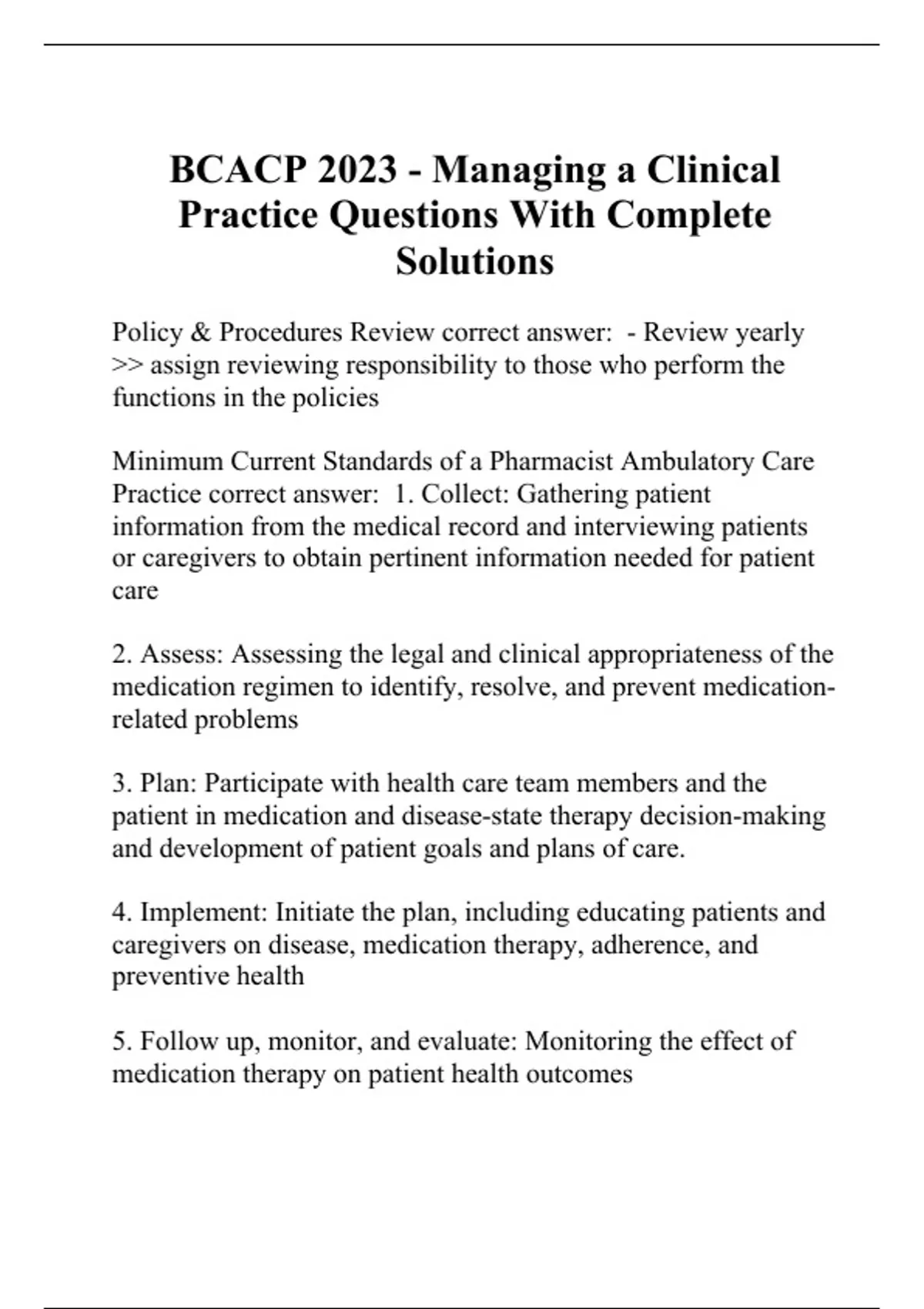 Policy & Procedures Review correct answer: - Review yearly >> assign reviewing responsibility to those who perform the functions in the policies Minimum Current Standards of a Pharmacist Ambulatory Care Practice correct answer: 1. Collect: Gathering patient information from the medical record and interviewing patients or caregivers to obtain pertinent information needed for patient care 2. Assess: Assessing the legal and clinical appropriateness of the medication regimen to identify, resolve, and prevent medication-related problems 3. Plan: Participate with health care team members and the patient in medication and disease-state therapy decision-making and development of patient goals and plans of care. 4. Implement: Initiate the plan, including educating patients and caregivers on disease, medication therapy, adherence, and preventive health 5. Follow up, monitor, and evaluate: Monitoring the effect of medication therapy on patient health outcomes 6. Documenting and communicating services provided, as well as creating and maintaining medication profiles, medication-related plans of care, and other needed patient care documentation Collaborative Practice Agreement Review/Update correct answer: Yearly or as dictated by state laws, rules & regulations Features of effective teams correct answer: 1. Team leadership. Team leaders coordinate tasks of team members, plan daily work, are concerned with team member development, motivation, and establishing a positive atmosphere. Team leaders are usually physicians. 2. Mutual performance monitoring. Team members all require sufficient understanding of the environment within the workplace in order to monitor other team members such that any member is able to step in and assist when task overload or lapses are identified. 3. Backup behavior. Team members have sufficient understanding of others' tasks to enable effective redistribution of workload or needed support with the variances in service demand. 4. Adaptability. Adaptability enables the team to respond to changes in environment in order to change patient management and work flow as needed to maintain patient care and the desired outcomes. 5. Team orientation. Willingness to take others' ideas and perspectives into account and a belief that team goals should be aligned with what is best for the patient, e.g., patient centeredness.