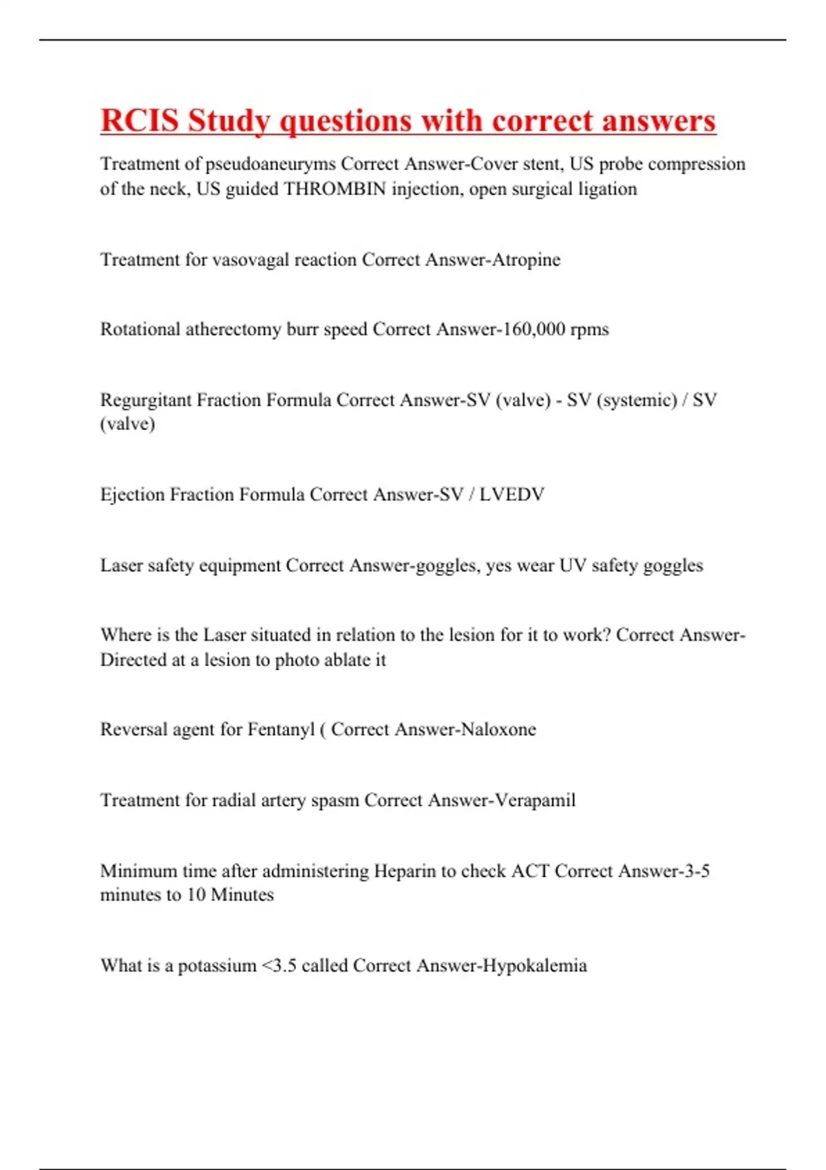Treatment of pseudoaneuryms Correct Answer-Cover stent, US probe compression of the neck, US guided THROMBIN injection, open surgical ligation Treatment for vasovagal reaction Correct Answer-Atropine Rotational atherectomy burr speed Correct Answer-160,000 rpms Regurgitant Fraction Formula Correct Answer-SV (valve) - SV (systemic) / SV (valve) Ejection Fraction Formula Correct Answer-SV / LVEDV Laser safety equipment Correct Answer-goggles, yes wear UV safety goggles Where is the Laser situated in relation to the lesion for it to work? Correct Answer-Directed at a lesion to photo ablate it Reversal agent for Fentanyl ( Correct Answer-Naloxone