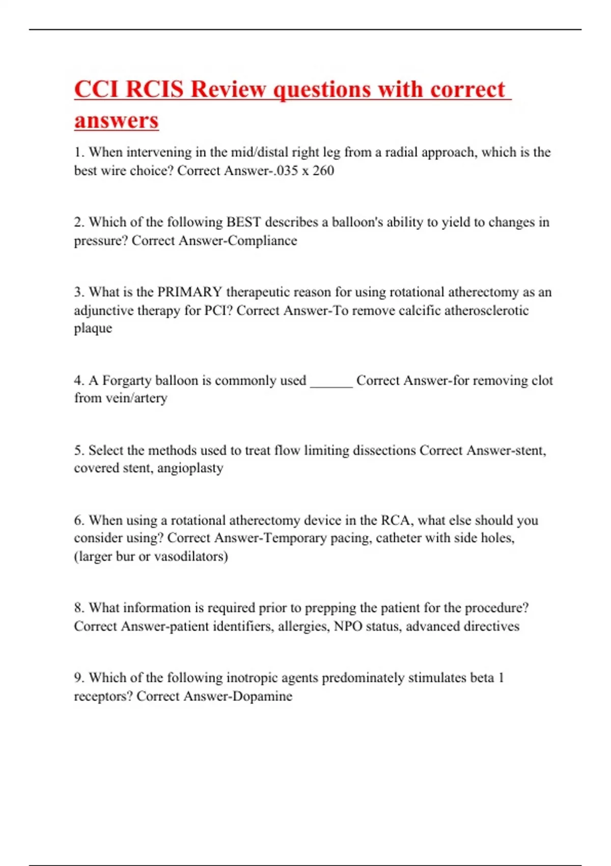 1. When intervening in the mid/distal right leg from a radial approach, which is the best wire choice? Correct Answer-.035 x 260 2. Which of the following BEST describes a balloon's ability to yield to changes in pressure? Correct Answer-Compliance 3. What is the PRIMARY therapeutic reason for using rotational atherectomy as an adjunctive therapy for PCI? Correct Answer-To remove calcific atherosclerotic plaque 4. A Forgarty balloon is commonly used ______ Correct Answer-for removing clot from vein/artery 5. Select the methods used to treat flow limiting dissections Correct Answer-stent, covered stent, angioplasty 6. When using a rotational atherectomy device in the RCA, what else should you consider using? Correct Answer-Temporary pacing, catheter with side holes, (larger bur or vasodilators) 8. What information is required prior to prepping the patient for the procedure? Correct Answer-patient identifiers, allergies, NPO status, advanced directives 9. Which of the following inotropic agents predominately stimulates beta 1 receptors? Correct Answer-Dopamine