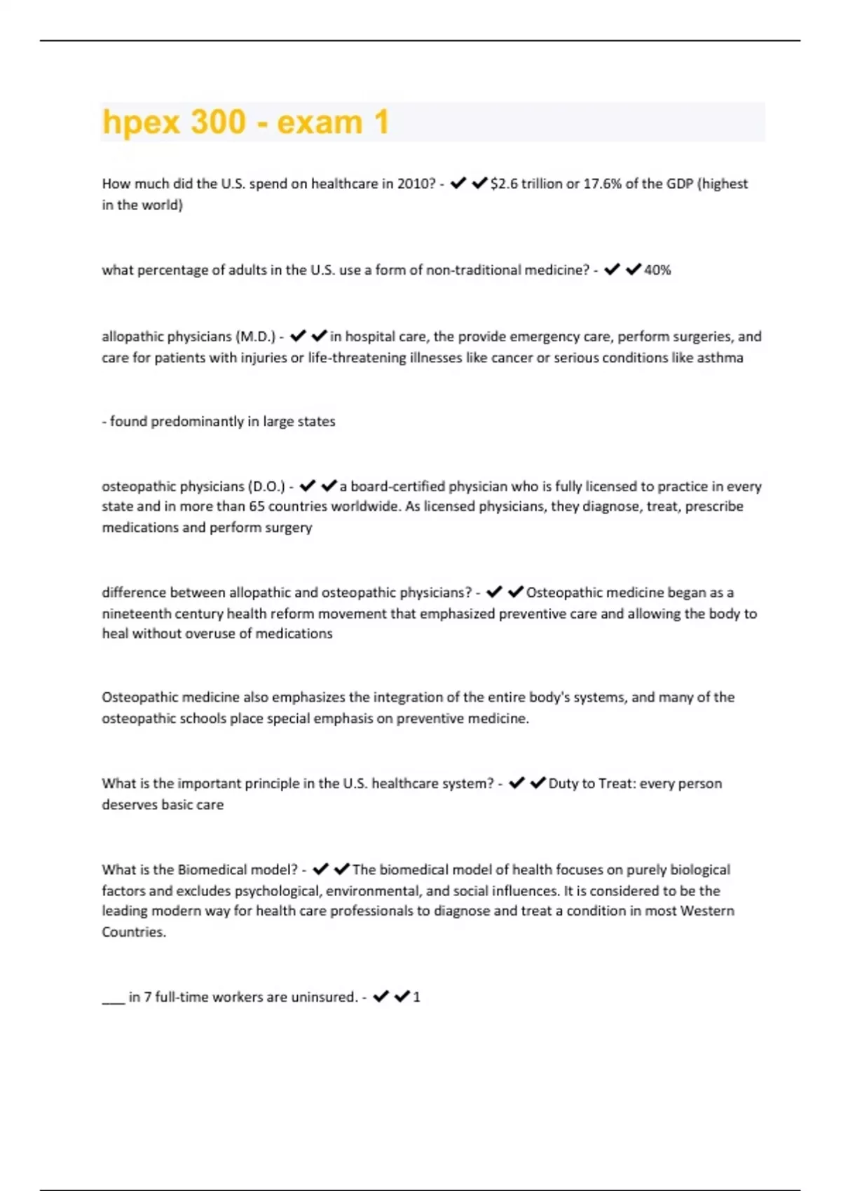 How much did the U.S. spend on healthcare in 2010? - $2.6 trillion or 17.6% of the GDP (highest in the world) what percentage of adults in the U.S. use a form of non-traditional medicine? - 40% allopathic physicians (M.D.) - in hospital care, the provide emergency care, perform surgeries, and care for patients with injuries or life-threatening illnesses like cancer or serious conditions like asthma - found predominantly in large states osteopathic physicians (D.O.) - a board-certified physician who is fully licensed to practice in every state and in more than 65 countries worldwide. As licensed physicians, they diagnose, treat, prescribe medications and perform surgery difference between allopathic and osteopathic physicians? - Osteopathic medicine began as a nineteenth century health reform movement that emphasized preventive care and allowing the body to heal without overuse of medications Osteopathic medicine also emphasizes the integration of the entire body's systems, and many of the osteopathic schools place special emphasis on preventive medicine. What is the important principle in the U.S. healthcare system? - Duty to Treat: every person deserves basic care What is the Biomedical model? - The biomedical model of health focuses on purely biological factors and excludes psychological, environmental, and social influences. It is considered to be the leading modern way for health care professionals to diagnose and treat a condition in most Western Countries. ___ in 7 full-time workers are uninsured. - 1What industries reported more work related injuries than any other private industry? - The healthcare industry and Social Assistance Industry _____ ______ rates are an indication of the health in a population - life expectancy How many health districts are in the commonwealth of Virginia - 35 who is the current commissioner of health for the commonwealth of virginia? -Dr. Marissa Levine ________ _______ focuses on actions such as those in the health care industry that impact an individuals safety and well-being. - social regulation Who is the chief health educator in the U.S.? - U.S. surgeon general Responsible for accrediting and inspecting mammography facilities - The FDA (Food and Drug Administration) Responsible for ensuring that all government levels have an emergency preparedness plan for all catastrophic events - Department of Homeland Security What passage established the medicaid and medicare programs in 1965 that mandated the governments role in providing healthcare and coverage? - the Social Security Act of 1935