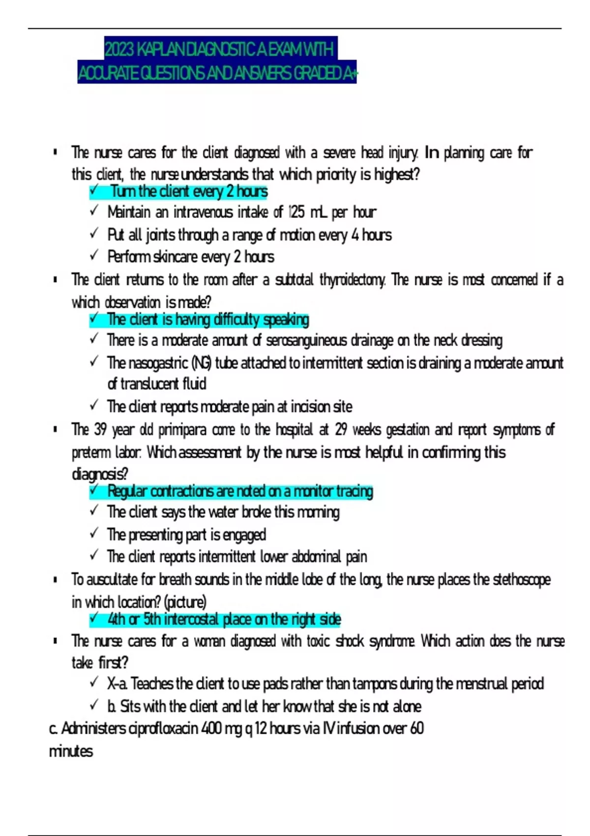 2023 QABA Practice Exam With 100% Correct Questions And Verified Answers from Relias trainings *Which of the following behaviors might serve a "gain attention" function?* A. Running out of the room B. Staring at a ceiling fan in a room C. Making silly noises D. Hiding in a closet - Answer C Feedback: Making silly noises might serve as a "gain attention" function. *A BBP exposure incident includes contact with blood or OPIM via all except:* A. Intact skin B. Non-intact skin C. Mucous membrane D. Mouth - Answer A Feedback: Contact with intact skin would not be considered a BBP exposure incident. *Non-accidental, inappropriate contact or the use of force with an individual that causes injury or physical pain is considered which type of abuse?* A. Mental/emotional abuse B. Sexual abuse C. Physical abuse D. Neglect - Answer C Feedback: Physical abuse is non-accidental, inappropriate contact or the use of force with an individual that causes injury or physical pain. Physical abuse may include acts of violence, inappropriate punishments like confinement, or actions that usually cause pain and injury against adults who are incapable of expressing pain or injury. *Which of the following is an example of discretionary effort as defined by Daniels (2000)?* A. Cindy follows all of her supervisor's instructions and is never late to work. B. Susanna cleans the work area and organizes materials without being asked. C. Marco finds what his colleagues are doing incorrectly and trains them on the correct procedure. D. Lynn reads informational articles about ABA when she is at home. - Answer B Feedback: Cleaning the work area and organizing materials without being asked is an example of discretionary effort. *Which of the following best explains the primary purpose of the BACB's Professional and Ethical Compliance code?* A. The purpose of the Professional and Ethical Compliance Code is to offer suggestions as how to treat clients and colleagues. B. The purpose of the Professional and Ethical Compliance Code is to restrict the practice of behavior analysis to certain well-defined circumstances. C. The purpose of the Professional and Ethical Compliance Code is to provide guidelines for certified and credentialed individuals to follow when they are providing behavior analysis services. D. The purpose of the Professional and Ethical Compliance Code is to mandate specific tasks and behaviors for all certified and credentialed individuals. - Answer C Feedback: The purpose of the Professional and Ethical Compliance Code is to provide guidelines for providing behavior analytic services. *If you have an individual who engages in escape behaviors you should:* A. Alternate antecedent interventions daily to see which ones are the most effective. B. Provide all antecedent interventions that can prevent escape. C. Tailor antecedent interventions to the person you support based on data from the FBA. D. Choose 3 antecedent interventions for escape maintained behaviors - Answer C Feedback: You should tailor the antecedent interventions based on the data from the FBA. Just trying random interventions out without knowing how the person will respond is risky