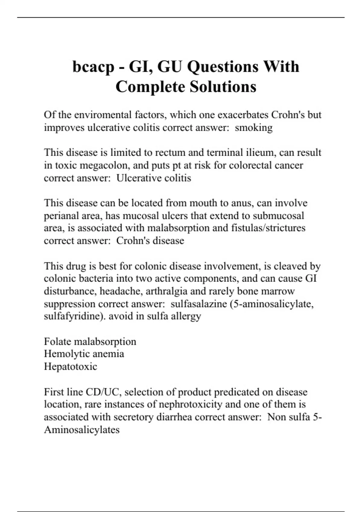 Of the enviromental factors, which one exacerbates Crohn's but improves ulcerative colitis correct answer: smoking This disease is limited to rectum and terminal ilieum, can result in toxic megacolon, and puts pt at risk for colorectal cancer correct answer: Ulcerative colitis This disease can be located from mouth to anus, can involve perianal area, has mucosal ulcers that extend to submucosal area, is associated with malabsorption and fistulas/strictures correct answer: Crohn's disease This drug is best for colonic disease involvement, is cleaved by colonic bacteria into two active components, and can cause GI disturbance, headache, arthralgia and rarely bone marrow suppression correct answer: sulfasalazine (5-aminosalicylate, sulfafyridine). avoid in sulfa allergy Folate malabsorption Hemolytic anemia Hepatotoxic First line CD/UC, selection of product predicated on disease location, rare instances of nephrotoxicity and one of them is associated with secretory diarrhea correct answer: Non sulfa 5-Aminosalicylates olsalazine = secretory diarrhea Use what sparingly because of risk of toxic megacolon correct answer: antidiarrheals. (immodium, hyoscyamine, probantheline, dicyclocmine) These have no role in maintenance but up to 50% of pts can become dependent. One product is indicated in terminal ileum or ascending colon disease. correct answer: Corticosteroids Budesonide (terminal ileum, ascending colon) Aminosalicylate products used for colonic involvement correct answer: Asacol HD, Pentasa, Lialda, Apriso, Dipentum, Balsalazide Aminosalicylate products for rectum involvement correct answer: Canasa suppository Rowasa enema is indicated for what type of IBD correct answer: rectum and terminal colon Used due to steroid sparing effect. Can be used for maintenance due to long onset of action. Need to determine thiopurine methyltransferase activity prior to prescribing. Can cause pancreatitis, bone marrow suppression, hepatotoxicity. correct answer: 6-MP, Azathioprine. Used for Crohn's maintenance, has long onset of action (mos to one year), can be steroid sparing, and can cause bone marrow suppression, pulmonary toxicity, hepatotoxicity, diarrhea, rash. correct answer: MTX - 15-25mg weekly IM Chimeric antibody against TNF. Useful for fistulizing CD, and moderate to severe UC/CD. 50% develop antinuclear antibodies. Side effects are infection, HF exacerbation, BBW- cancers such as hepatosplenic T-Cell lymphoma correct answer: Infliximab Dose of Infliximab if used in heart failure correct answer: