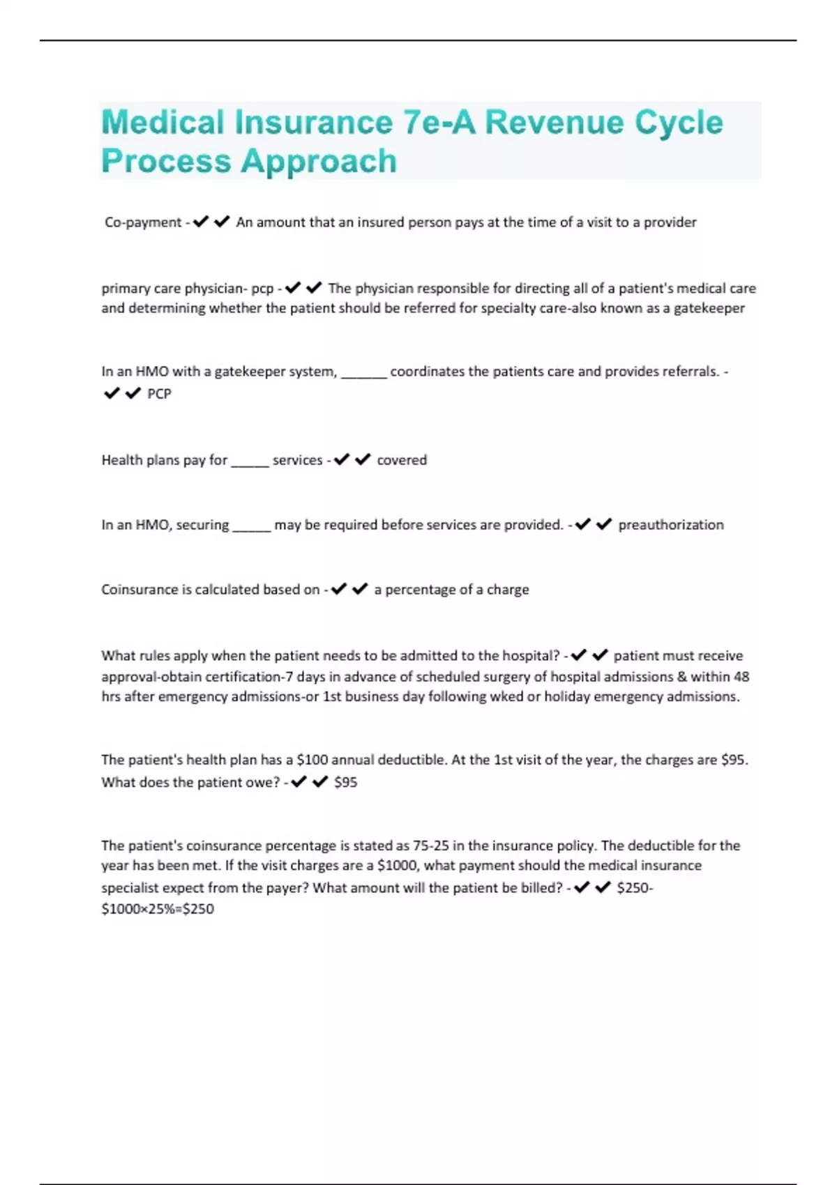Co-payment - An amount that an insured person pays at the time of a visit to a provider primary care physician- pcp - The physician responsible for directing all of a patient's medical care and determining whether the patient should be referred for specialty care-also known as a gatekeeper In an HMO with a gatekeeper system, ______ coordinates the patients care and provides referrals. - PCP Health plans pay for _____ services - covered In an HMO, securing _____ may be required before services are provided. - preauthorization Coinsurance is calculated based on - a percentage of a charge What rules apply when the patient needs to be admitted to the hospital? -patient must receive approval-obtain certification-7 days in advance of scheduled surgery of hospital admissions & within 48 hrs after emergency admissions-or 1st business day following wked or holiday emergency admissions. The patient's health plan has a $100 annual deductible. At the 1st visit of the year, the charges are $95. What does the patient owe? - $95 The patient's coinsurance percentage is stated as 75-25 in the insurance policy. The deductible for the year has been met. If the visit charges are a $1000, what payment should the medical insurance specialist expect from the payer? What amount will the patient be billed? - $250- $1000×25%=$250The patient's coinsurance percentage is stated as 80-20 in the insurance policy. The deductible for the year has been met. If the visit charges are $420, what payment should the medical insurance specialist expect from the payer? What amount will the patient be billed? - $84-$420×20%=$84