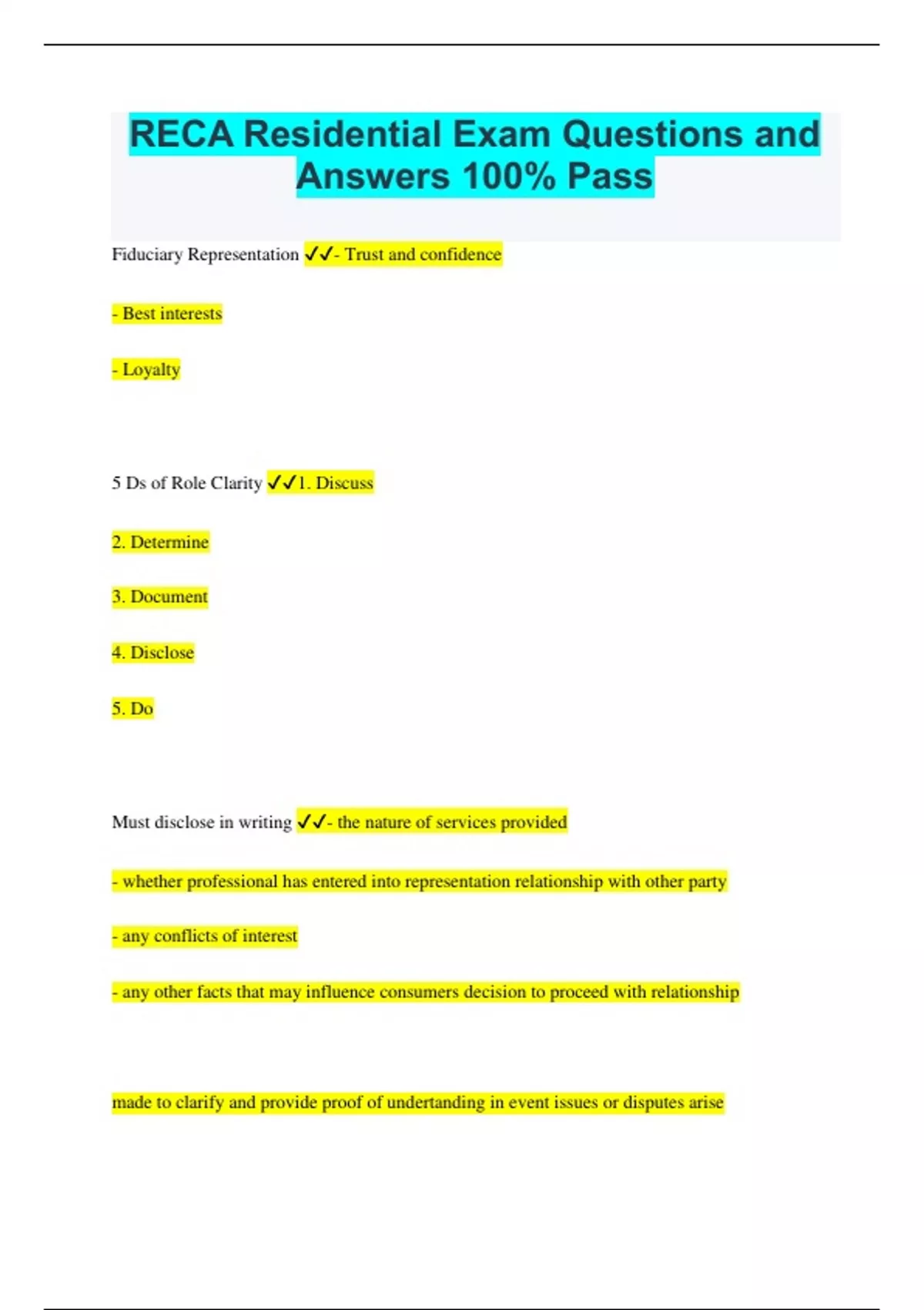 RECA Residential Exam Questions and Answers 100% Pass Fiduciary Representation - Trust and confidence - Best interests - Loyalty 5 Ds of Role Clarity 1. Discuss 2. Determine 3. Document 4. Disclose 5. Do Must disclose in writing - the nature of services provided - whether professional has entered into representation relationship with other party - any conflicts of interest - any other facts that may influence consumers decision to proceed with relationship made to clarify and provide proof of undertanding in event issues or disputes arise