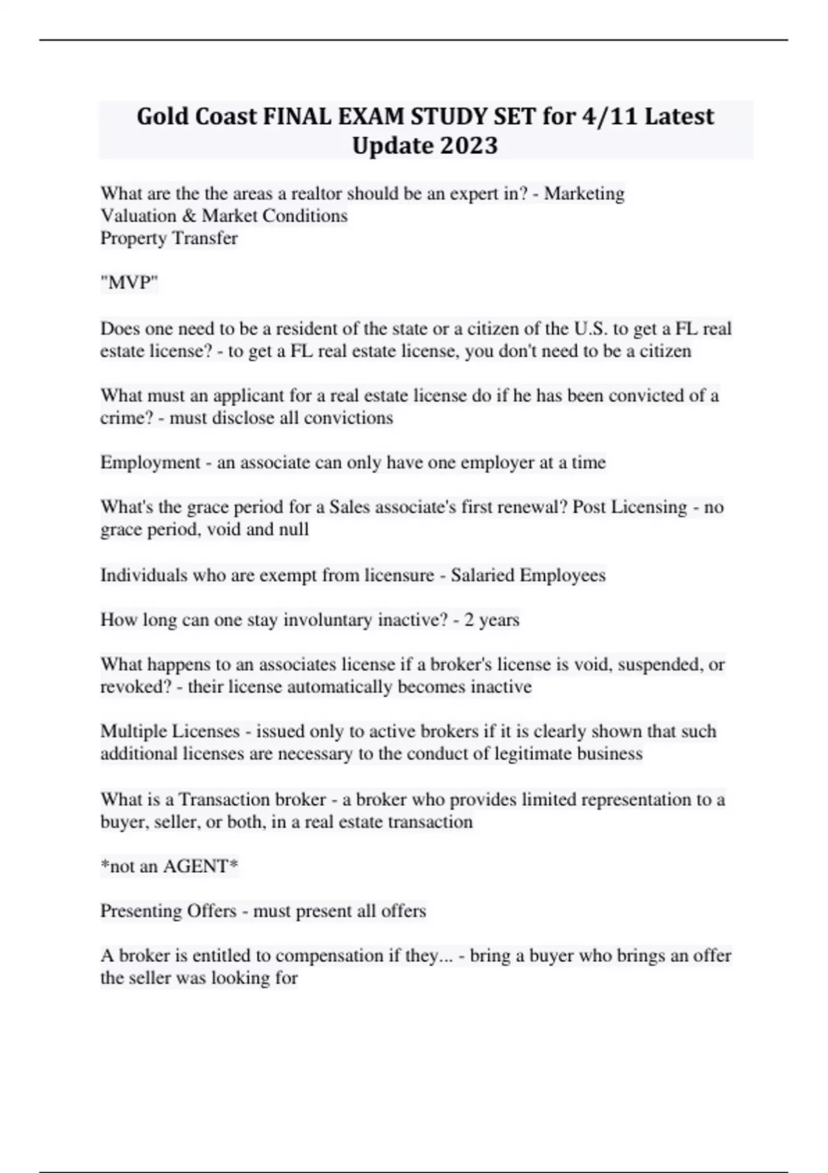 What are the the areas a realtor should be an expert in? - Marketing Valuation & Market Conditions Property Transfer "MVP" Does one need to be a resident of the state or a citizen of the U.S. to get a FL real estate license? - to get a FL real estate license, you don't need to be a citizen What must an applicant for a real estate license do if he has been convicted of a crime? - must disclose all convictions Employment - an associate can only have one employer at a time What's the grace period for a Sales associate's first renewal? Post Licensing - no grace period, void and null Individuals who are exempt from licensure - Salaried Employees How long can one stay involuntary inactive? - 2 years What happens to an associates license if a broker's license is void, suspended, or revoked? - their license automatically becomes inactive Multiple Licenses - issued only to active brokers if it is clearly shown that such additional licenses are necessary to the conduct of legitimate business What is a Transaction broker - a broker who provides limited representation to a buyer, seller, or both, in a real estate transaction *not an AGENT* Presenting Offers - must present all offers A broker is entitled to compensation if they... - bring a buyer who brings an offer the seller was looking for Listing Contract - broker's employment contract that states the terms and conditions that the broker must meet to become eligible for compensation