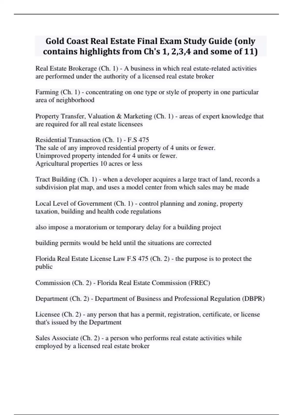 Real Estate Brokerage (Ch. 1) - A business in which real estate-related activities are performed under the authority of a licensed real estate broker Farming (Ch. 1) - concentrating on one type or style of property in one particular area of neighborhood Property Transfer, Valuation & Marketing (Ch. 1) - areas of expert knowledge that are required for all real estate licensees Residential Transaction (Ch. 1) - F.S 475 The sale of any improved residential property of 4 units or fewer. Unimproved property intended for 4 units or fewer. Agricultural properties 10 acres or less Tract Building (Ch. 1) - when a developer acquires a large tract of land, records a subdivision plat map, and uses a model center from which sales may be made Local Level of Government (Ch. 1) - control planning and zoning, property taxation, building and health code regulations also impose a moratorium or temporary delay for a building project building permits would be held until the situations are corrected Florida Real Estate License Law F.S 475 (Ch. 2) - the purpose is to protect the public Commission (Ch. 2) - Florida Real Estate Commission (FREC) Department (Ch. 2) - Department of Business and Professional Regulation (DBPR) Licensee (Ch. 2) - any person that has a permit, registration, certificate, or license that's issued by the Department Sales Associate (Ch. 2) - a person who performs real estate activities while employed by a licensed real estate broker