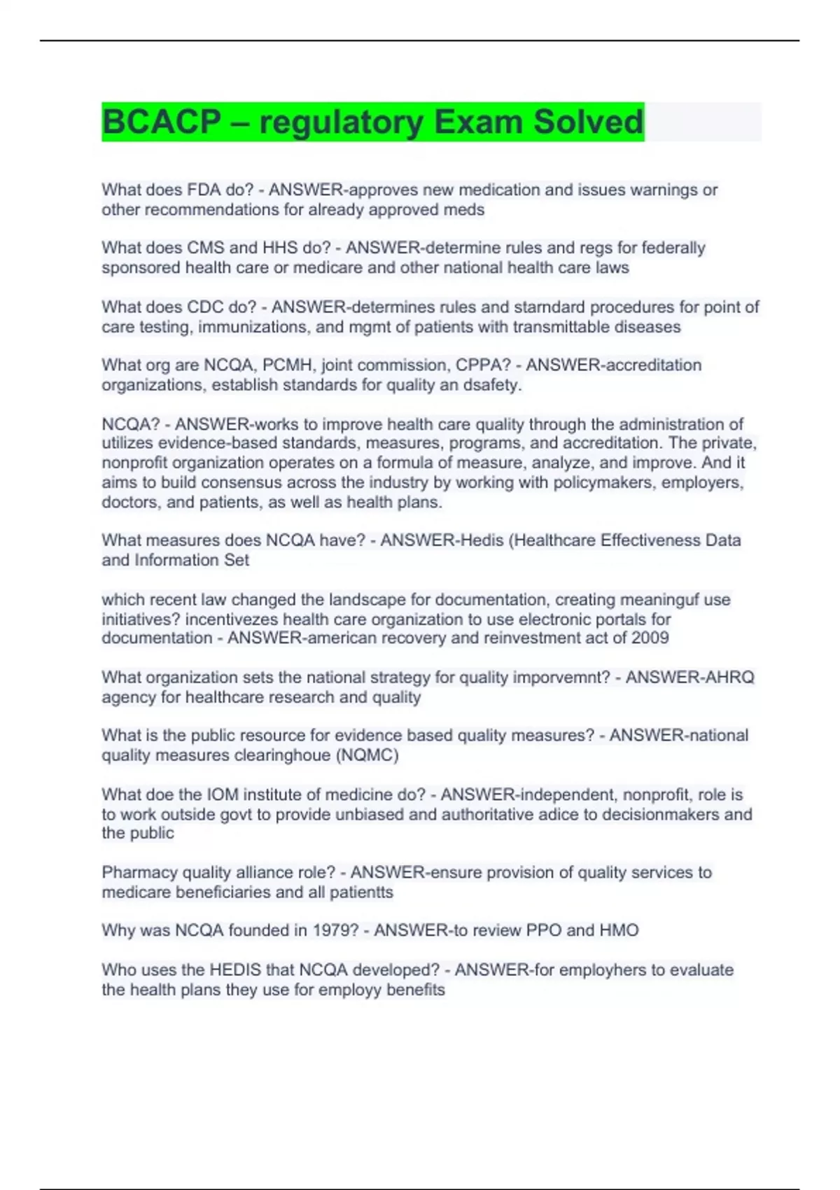 What does FDA do? - ANSWER-approves new medication and issues warnings or other recommendations for already approved meds What does CMS and HHS do? - ANSWER-determine rules and regs for federally sponsored health care or medicare and other national health care laws What does CDC do? - ANSWER-determines rules and starndard procedures for point of care testing, immunizations, and mgmt of patients with transmittable diseases What org are NCQA, PCMH, joint commission, CPPA? - ANSWER-accreditation organizations, establish standards for quality an dsafety. NCQA? - ANSWER-works to improve health care quality through the administration of utilizes evidence-based standards, measures, programs, and accreditation. The private, nonprofit organization operates on a formula of measure, analyze, and improve. And it aims to build consensus across the industry by working with policymakers, employers, doctors, and patients, as well as health plans. What measures does NCQA have? - ANSWER-Hedis (Healthcare Effectiveness Data and Information Set which recent law changed the landscape for documentation, creating meaninguf use initiatives? incentivezes health care organization to use electronic portals for documentation - ANSWER-american recovery and reinvestment act of 2009 What organization sets the national strategy for quality imporvemnt? - ANSWER-AHRQ agency for healthcare research and quality What is the public resource for evidence based quality measures? - ANSWER-national quality measures clearinghoue (NQMC) What doe the IOM institute of medicine do? - ANSWER-independent, nonprofit, role is to work outside govt to provide unbiased and authoritative adice to decisionmakers and the public Pharmacy quality alliance role? - ANSWER-ensure provision of quality services to medicare beneficiaries and all patientts Why was NCQA founded in 1979? - ANSWER-to review PPO and HMO Who uses the HEDIS that NCQA developed? - ANSWER-for employhers to evaluate the health plans they use for employy benefits