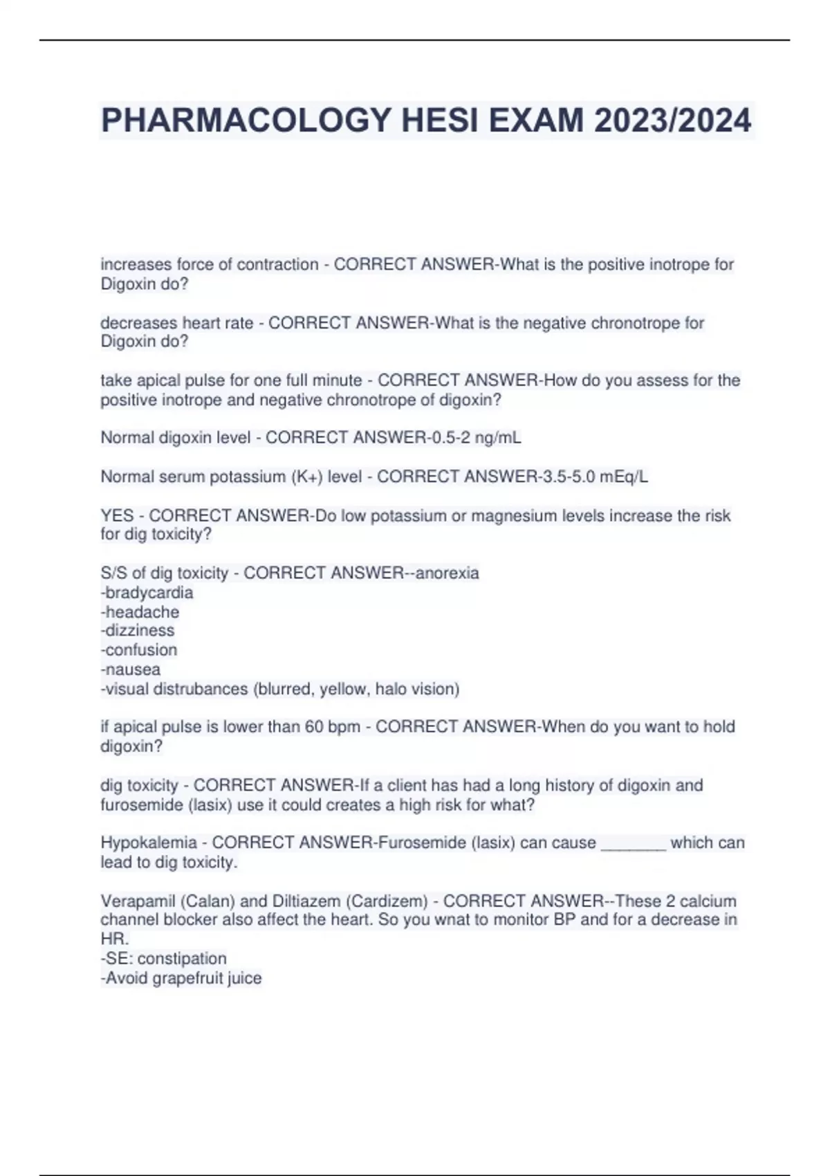 PHARMACOLOGY HESI EXAM 2023/2024 increases force of contraction - CORRECT ANSWER-What is the positive inotrope for Digoxin do? decreases heart rate - CORRECT ANSWER-What is the negative chronotrope for Digoxin do? take apical pulse for one full minute - CORRECT ANSWER-How do you assess for the positive inotrope and negative chronotrope of digoxin? Normal digoxin level - CORRECT ANSWER-0.5-2 ng/mL Normal serum potassium (K+) level - CORRECT ANSWER-3.5-5.0 mEq/L YES - CORRECT ANSWER-Do low potassium or magnesium levels increase the risk for dig toxicity? S/S of dig toxicity - CORRECT ANSWER--anorexia -bradycardia -headache -dizziness -confusion -nausea -visual distrubances (blurred, yellow, halo vision) if apical pulse is lower than 60 bpm - CORRECT ANSWER-When do you want to hold digoxin? dig toxicity - CORRECT ANSWER-If a client has had a long history of digoxin and furosemide (lasix) use it could creates a high risk for what? Hypokalemia - CORRECT ANSWER-Furosemide (lasix) can cause _______ which can lead to dig toxicity. Verapamil (Calan) and Diltiazem (Cardizem) - CORRECT ANSWER--These 2 calcium channel blocker also affect the heart. So you wnat to monitor BP and for a decrease in HR. -SE: constipation -Avoid grapefruit juice -dipine ending drugs (like amlodipine) - CORRECT ANSWER--these calcium channel blockers affect vessels only (vasodilation) -SE: dizziness, facial flushing, edema, hypotension Furosemide (Lasix) - CORRECT ANSWER--loop diuretic -rapid acting -used foe rapid diuresis in emergencies (Pulmonary embolism) -may produce hypokalemia (assess for muscle craps or weakness) -Hypotension, F/E abnormalities, dehydration, SE of furosemide (Lasix) - CORRECT ANSWER--dizziness, -headache -tinnitus -Nausea, vomiting, diarrhea -decreased potassium -hyperglycemia -ototoxicity with aminoglycosides (-mycin drugs) Potassium sparing diuretics - CORRECT ANSWER--Spironolactone (Aldactone) -amiloride (Midamor) -triamterene (Dyrenium) -can cause increased potassium -blocks receptors for aldosterone -inhibits sodium and water reabsorption -take in the morning (diuretics in morning if possible) -avoid salt substitutes, ACE inhibitors, ARBs -often take with other (thiazide) diuretics to treat edema, hypertension, heart failure -can be taken with other meds that lower potassium - CORRECT ANSWER-what do you want to teach a patient who is on a potassium sparing diuretic? vasoconstriction - CORRECT ANSWER-What is the stimulation of alpha 1? you always want to check the apical pulse, hold if less than 60 - CORRECT ANSWERWhat do you want to always check when giving a beta blocker (-lol) respiratory conditions - CORRECT ANSWER-Since a beta blocker is cardio- selective you want to also assess what prior to administering? Mydriatics - CORRECT ANSWER-agents used to produce dilation of pupils for eye exams and ocular surgery Tamsulosin (Flomax) - CORRECT ANSWER--alpha 1 adrenergic blocker -decreases smooth muscle contraction of prostate capsules and bladder neck - used to treat BPH ***Alpha one blockers -zosin - antihypertensives*** Dopamine - CORRECT ANSWER-What drug is the only drug that can activate dopamine in the body? Extravasation - CORRECT ANSWER-Catecholamines (epinepherine, norepinepherine, dopamine, doubutamine, ect.) must be watched carefully for what? use a soft tooth brush, use electric razors, do not got without shoes - CORRECT ANSWER-What do you want to teach those on warfarin (Coumadin) to do to avoid bleeding? teaching for those on warfarin (coumadin) - CORRECT ANSWER--maintain vitamin K foods (greens, mustard greens,) in diet; do not increase or decrease them -PT/INR moitoring -avoid activities that may cause bleeding Clopidogrel (Plavix) - CORRECT ANSWER--Antiplatelet -you want to hold 7-10 days before the surgery (may not have to hold aspirin, contact MD) Pentoxifylline (Trental) - CORRECT ANSWER--for intermittent claudication -treats ischemic pain Heparin - CORRECT ANSWER--a high alert medication -requires another nurse to check the dosage -a potential SE would be bleeding protamine sulfate - CORRECT ANSWER-What is the antidote/reversal agent for Heparin? chronic pain - CORRECT ANSWER-What is morphine sulfate continued release used for? produce CNS depression and respiratory depression - CORRECT ANSWER-What can opioids do? Common opioids - CORRECT ANSWER--morphine -hydrocodone -oxycodone -hydromorphone [dilaudid] -codine Naloxone (Narcan) - CORRECT ANSWER-What do you want to give as the antidote for opioids (like to reverse respiratory depression and analgesia)? -may need to be titrated SE of opioids - CORRECT ANSWER--constipation -pruritis -urinary retention -decreased BP and heart rate Methadone (Dolophine) - CORRECT ANSWER-treatment of breakthrough pain. Half-life is longer than duration of action. With repeated doses drug accumulates in the tissues, which is then slowly released. Allows for 24-hour dosing. Aspirin (ASA) - CORRECT ANSWER--Antiplatelet -cautions with peptic ulcer disease (PUD) -cautions with children younger than the age of 18 with recent viral illness (Reyes syndrome) -interacts with other antiplatelets, anticoagulants, NSAIDs (etc) ***WATCH FOR BLEEDING!!!!*** Pregabalin (Lyrica) - CORRECT ANSWER--Nonopioid analgesic for peripheral neuropathy, postherpetic (shingles) neuralgia, fibromyalgia. -SE: suicidal thoughts, dizziness, drowsiness, edema, dry mouth, abdominal pain, constipation. Ketorolac (Toradol) - CORRECT ANSWER--NSAID (causes gastric irritation) -should e]be given with meals or snacks -has pain relief like morphine but is not a opioid -it is used for post-op pain not chronic pain -do not give this med for more than 5 days Diclofenac (Zipsor) - CORRECT ANSWER--NSAID -can increase LFTs (hepatotoxicity) -like other NSAIDs may increase the risk of MI and stroke -SE are the same as NSAIDs, including GI bleeding -S/S of anemia Celecoxib (Celebrex) - CORRECT ANSWER--COX-2 inhibitor (NSAID) for decreasing inflammation, reducing pain and fever -has a cross sensit