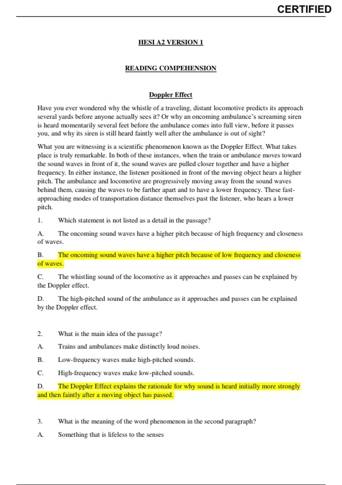 HESI A2 ENTRANCE(GRADED A+) HESI A2 VERSION 1 READING COMPEHENSION Doppler Effect Have you ever wondered why the whistle of a traveling, distant locomotive predicts its approach several yards before anyone actually sees it? Or why an oncoming ambulance’s screaming siren is heard momentarily several feet before the ambulance comes into full view, before it passes you, and why its siren is still heard faintly well after the ambulance is out of sight? What you are witnessing is a scientific phenomenon known as the Doppler Effect. What takes place is truly remarkable. In both of these instances, when the train or ambulance moves toward the sound waves in front of it, the sound waves are pulled closer together and have a higher frequency. In either instance, the listener positioned in front of the moving object hears a higher pitch. The ambulance and locomotive are progressively moving away from the sound waves behind them, causing the waves to be farther apart and to have a lower frequency. These fastapproaching modes of transportation distance themselves past the listener, who hears a lower pitch. 1. Which statement is not listed as a detail in the passage? A. The oncoming sound waves have a higher pitch because of high frequency and closeness of waves. B. The oncoming sound waves have a higher pitch because of low frequency and closeness of waves. C. The whistling sound of the locomotive as it approaches and passes can be explained by the Doppler effect. D. The high-pitched sound of the ambulance as it approaches and passes can be explained by the Doppler effect. 2. What is the main idea of the passage? A. Trains and ambulances make distinctly loud noises. B. Low-frequency waves make high-pitched sounds. C. High-frequency waves make low-pitched sounds. D. The Doppler Effect explains the rationale for why sound is heard initially more strongly and then faintly after a moving object has passed. 3. What is the meaning of the word phenomenon in the second paragraph? A. Something that is lifeless to the senses CERTIFIED B. Something that is nonchalant C. Something that is significant but unusual D. Something that is chemical in origin 4. What is the author’s primary purpose in writing this essay? A. To entertain the reader with information about trains and ambulances B. To inform the reader about avoiding accidents, which involve trains and ambulances C. To inform the reader about how movement af