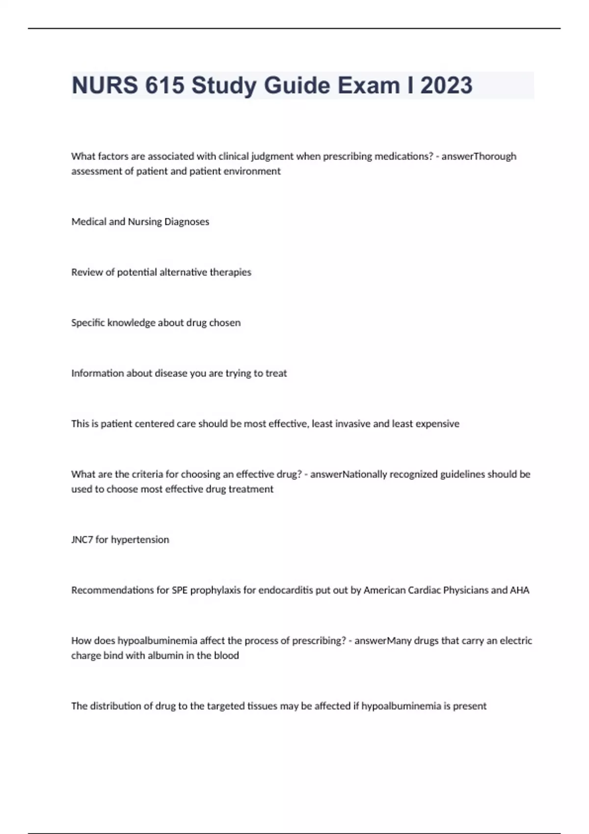NURS 615 Study Guide Exam with reviewed answers 2023 What factors are associated with clinical judgment when prescribing medications? Thorough assessment of patient and patient environment Medical and Nursing Diagnoses Review of potential alternative therapies Specific knowledge about drug chosen Information about disease you are trying to treat This is patient centered care should be most effective, least invasive and least expensive What are the criteria for choosing an effective drug? Nationally recognized guidelines should be used to choose most effective drug treatment JNC7 for hypertension Recommendations for SPE prophylaxis for endocarditis put out by American Cardiac Physicians and AHA How does hypoalbuminemia affect the process of prescribing? Many drugs that carry an electric charge bind with albumin in the blood The distribution of drug to the targeted tissues may be affected if hypoalbuminemia is present What is the drug's half-life? The amount of time for an administered to be half-way cleared from the body Takes 4-5x half life for drug serum to reach steady state after regular dosing is started, stopped, or the dose is changed Digoxin half life 24-36 hours change in dose will take a week for full effect Drugs with long half life like amiodarone 58day half life are usually started with a loading dose to achieve steady state more quickly. Must use half life to determine the length of time required between dosage administrations.