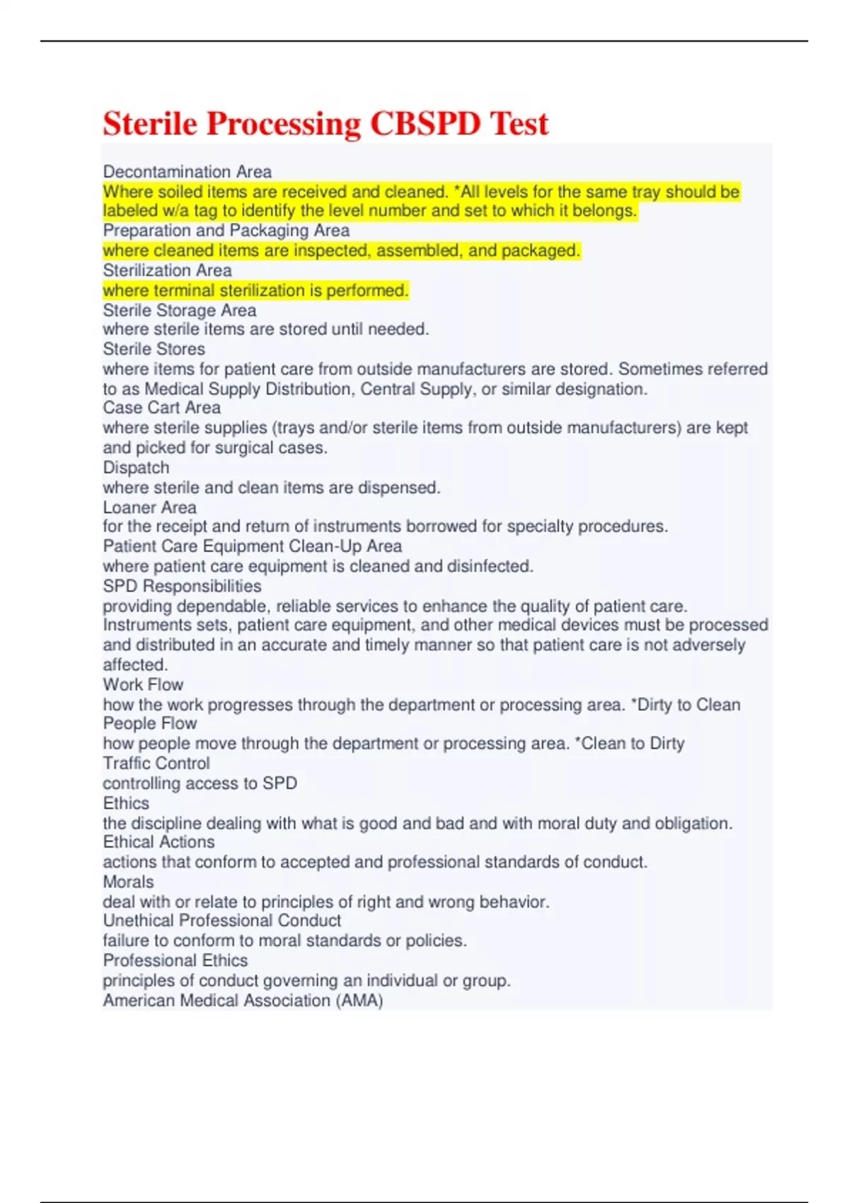 Sterile Processing CBSPD Test Decontamination Area Where soiled items are received and cleaned. *All levels for the same tray should be labeled w/a tag to identify the level number and set to which it belongs. Preparation and Packaging Area where cleaned items are inspected, assembled, and packaged. Sterilization Area where terminal sterilization is performed. Sterile Storage Area where sterile items are stored until needed. Sterile Stores where items for patient care from outside manufacturers are stored. Sometimes referred to as Medical Supply Distribution, Central Supply, or similar designation. Case Cart Area where sterile supplies (trays and/or sterile items from outside manufacturers) are kept and picked for surgical cases. Dispatch where sterile and clean items are dispensed. Loaner Area for the receipt and return of instruments borrowed for specialty procedures. Patient Care Equipment Clean-Up Area where patient care equipment is cleaned and disinfected. SPD Responsibilities providing dependable, reliable services to enhance the quality of patient care. Instruments sets, patient care equipment, and other medical devices must be processed and distributed in an accurate and timely manner so that patient care is not adversely affected. Work Flow how the work progresses through the department or processing area. *Dirty to Clean People Flow how people move through the department or processing area. *Clean to Dirty Traffic Control controlling access to SPD Ethics the discipline dealing with what is good and bad and with moral duty and obligation. Ethical Actions actions that conform to accepted and professional standards of conduct. Morals deal with or relate to principles of right and wrong behavior. Unethical Professional Conduct failure to conform to moral standards or policies. Professional Ethics principles of conduct governing an individual or group. American Medical Association (AMA)