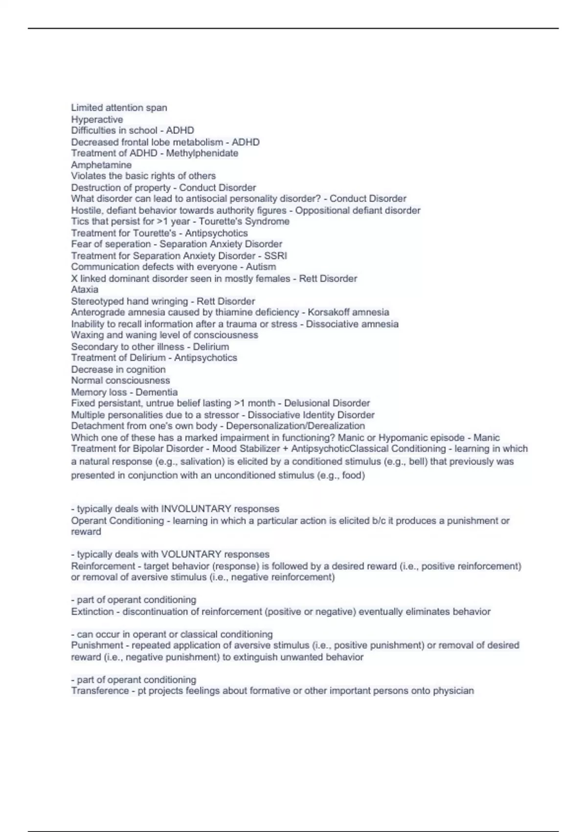 Limited attention span Hyperactive Difficulties in school - ADHD Decreased frontal lobe metabolism - ADHD Treatment of ADHD - Methylphenidate Amphetamine Violates the basic rights of others Destruction of property - Conduct Disorder What disorder can lead to antisocial personality disorder? - Conduct Disorder Hostile, defiant behavior towards authority figures - Oppositional defiant disorder Tics that persist for >1 year - Tourette's Syndrome Treatment for Tourette's - Antipsychotics Fear of seperation - Separation Anxiety Disorder Treatment for Separation Anxiety Disorder - SSRI Communication defects with everyone - Autism X linked dominant disorder seen in mostly females - Rett Disorder