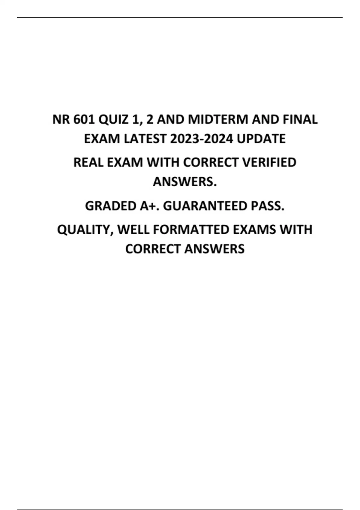 NR 601 QUIZ 1, 2 AND MIDTERM AND FINAL EXAM LATEST UPDATE REAL EXAM WITH CORRECT VERIFIED ANSWERS. GRADED A+. GUARANTEED PASS. QUALITY, WELL FORMATTED EXAMS WITH CORRECT ANSWERS