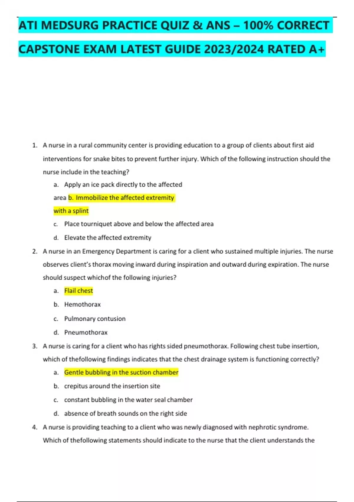 ATI MEDSURG PRACTICE QUIZ & ANS – 100% CORRECT CAPSTONE EXAM LATEST GUIDE 2023/2024 RATED A+ 1. A nurse in a rural community center is providing education to a group of clients about first aid interventions for snake bites to prevent further injury. Which of the following instruction should the nurse include in the teaching? a. Apply an ice pack directly to the affected area b. Immobilize the affected extremity with a splint c. Place tourniquet above and below the affected area