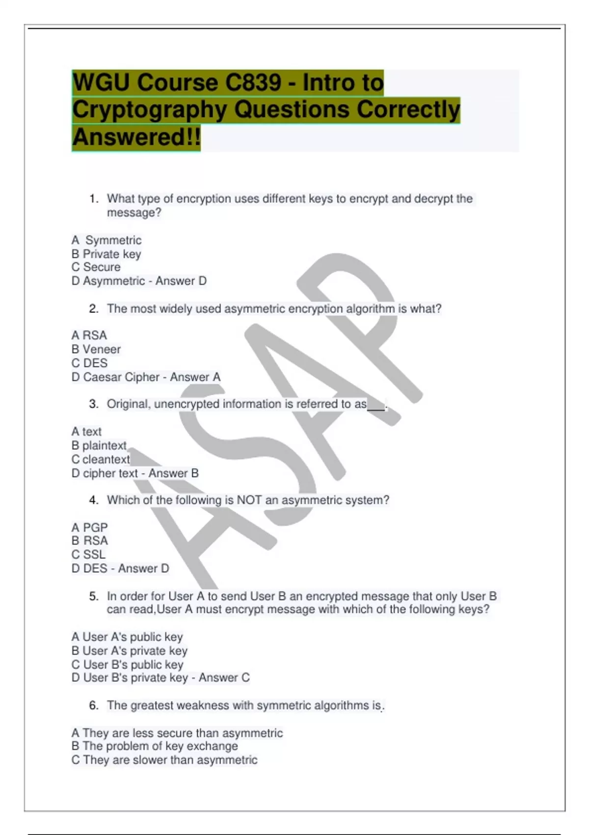 1. What type of encryption uses different keys to encrypt and decrypt the message? A Symmetric B Private key C Secure D Asymmetric - Answer D 2. The most widely used asymmetric encryption algorithm is what? A RSA B Veneer C DES D Caesar Cipher - Answer A 3. Original, unencrypted information is referred to as . A text B plaintext C cleantext D cipher text - Answer B 4. Which of the following is NOT an asymmetric system? A PGP B RSA C SSL D DES - Answer D 5. In order for User A to send User B an encrypted message that only User B can read, User A must encrypt message with which of the following keys? A User A's public key B User A's private key C User B's public key D User B's private key - Answer C