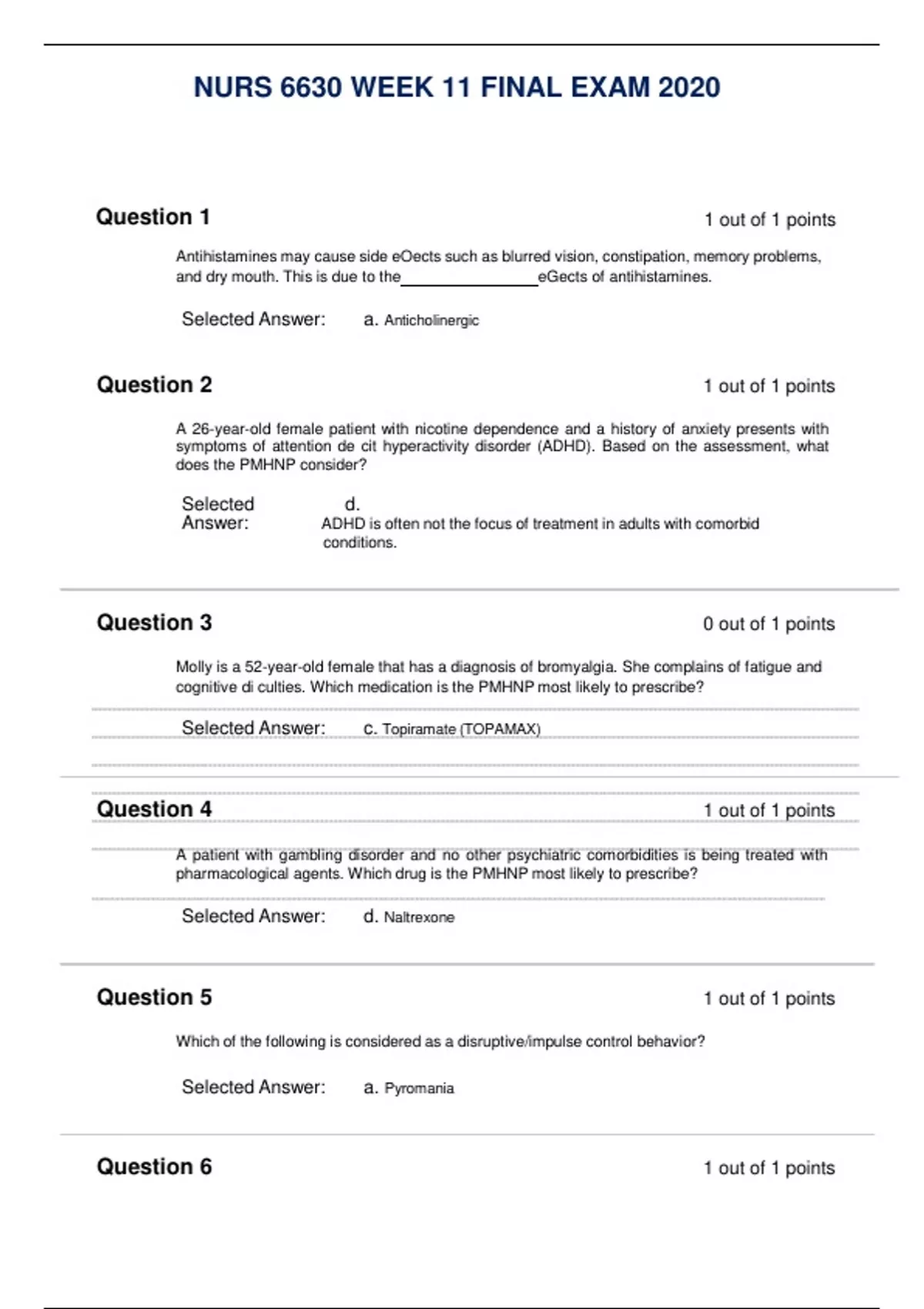 Question 1 1 out of 1 points Antihistamines may cause side eOects such as blurred vision, constipation, memory problems, and dry mouth. This is due to the eGects of antihistamines. Selected Answer: a. Anticholinergic Question 2 1 out of 1 points A 26-year-old female patient with nicotine dependence and a history of anxiety presents with symptoms of attention de cit hyperactivity disorder (ADHD). Based on the assessment, what does the PMHNP consider? Selected d. Answer: ADHD is often not the focus of treatment in adults with comorbid conditions. Question 3 0 out of 1 points Molly is a 52-year-old female that has a diagnosis of bromyalgia. She complains of fatigue and cognitive di culties. Which medication is the PMHNP most likely to prescribe? Selected Answer: c. Topiramate (TOPAMAX) Question 4 1 out of 1 points A patient with gambling disorder and no other psychiatric comorbidities is being treated with pharmacological agents. Which drug is the PMHNP most likely to prescribe? Selected Answer: d. Naltrexone Question 5 1 out of 1 points Which of the following is considered as a disruptive/impulse control behavior? Selected Answer: a. Pyromania Question 6 1 out of 1 points Kevin is an adolescent who has been diagnosed with kleptomania. His parents are interested in seeking pharmacological treatment. What does the PMHNP tell the parents regarding his treatment options? Selected Answer: c. “Naltrexone may be an appropriate option to discuss.” Question 7 1 out of 1 points A young patient is prescribed Vyvanse. During the follow-up appointment, which comment made by the patient makes the PMHNP think that the dosing is being done incorrectly? Selected Answer: b. “I am unable to fall asleep at night.” Question 8 1 out of 1 points The novel neurotransmitter adenosine is responsible for the sleep-wake cycle by increasing throughout the day and diminishing during night. Which of the follow is an antagonist of adenosine? Selected Answer: a. Ca eine Question 9 1 out of 1 points What will the PMHNP most likely prescribe to a patient with psychotic aggression who needs to manage the top-down cortical control and the excessive drive from striatal hyperactivity? Selected Answer: a. Antipsychotics Question 10 1 out of 1 points Mike wants to quit smoking. He has tried nicotine replacement and varenicline without success. He has asked for another medication to help him kick his habit. The PMHNP decides to try a medication that increases dopamine by prescribing a medications that can increase both norepinephrine and dopamine. Which medication did the PMHNP prescribe? Selected Answer: c. Bupropion (ZYBAN) Question 11 1 out of 1 points The PMHNP has been asked to provide an in-service training to include attention to the use of antipsychotics to treat Alzheimer’s. What does the PMHNP convey to sta ? Selected c. Answer: The use of an psycho cs may cause increased cardiovascular events and mortality and an psycho cs are o en used as “chemical straightjackets” to over- tranquilize pa ents. Question 12 1 out of 1 points The PMHNP is caring for a patient who openly admitted to drinking a quart of vodka daily. Prior to prescribing this patient disulJram (Antabuse), it is important for the PMHNP to: Selected Answer: b. Evaluate the patient’s willingness to abstain from alcohol Question 13 1 out of 1 points The PMHNP prescribes gabapentin (Neurontin) for a patient’s chronic pain. How does the PMHNP anticipate the drug to work? Selected d. Answer: It will bind to the alpha-2-delta ligand subunit of voltage-sensitive calcium channels. Question 14 1 out of 1 points The parents of a 7-year-old patient with ADHD are concerned about the eects of stimulants on their child. The parents prefer to start pharmacological treatment with a non-stimulant. Which medication will the PMHNP will most likely prescribe? Selected Answer: d. Strattera Question 15 1 out of 1 points A patient diagnosed with obsessive compulsive disorder has been taking a high-dose SSRI and is participating in therapy twice a week. He reports an inability to carry out responsibilities due to consistent interferences of his obsessions and compulsions. The PMHNP knows that the next step would be which of the following? Selected Answer: a. Decrease his SSRI and add buspirone (Buspar).