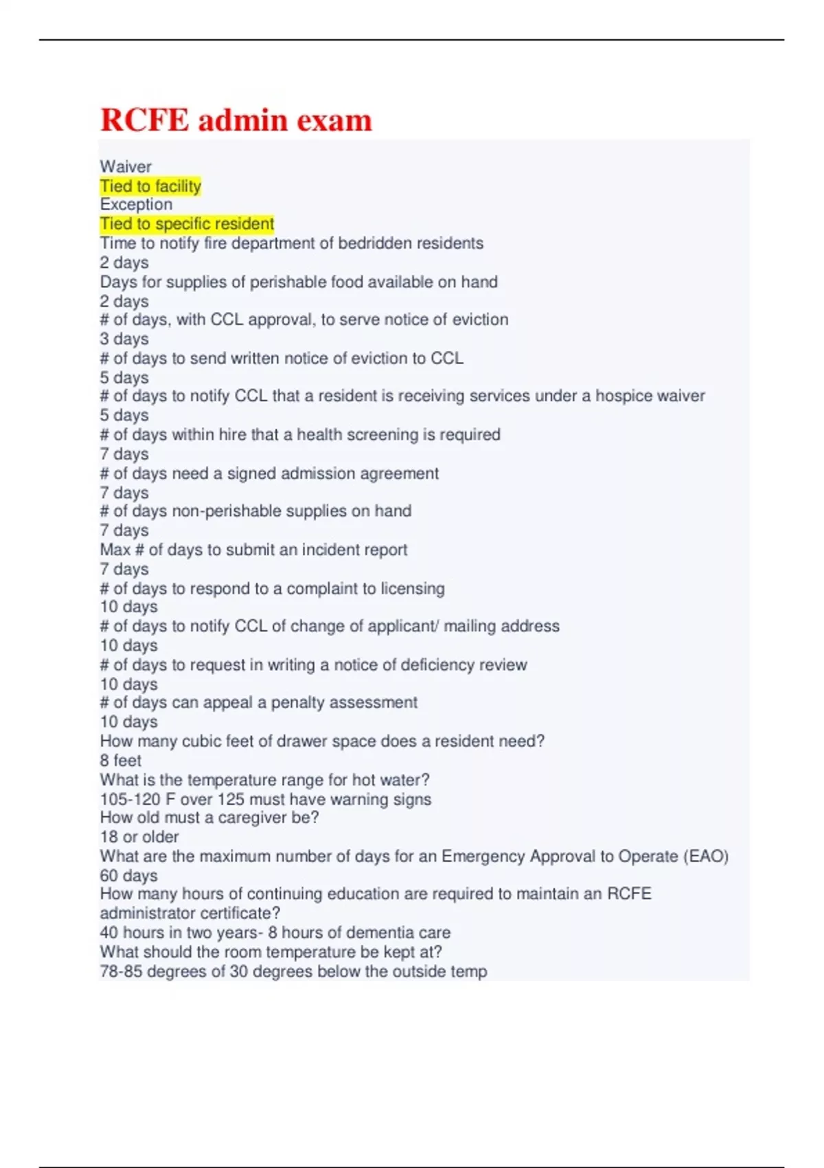 Waiver Tied to facility Exception Tied to specific resident Time to notify fire department of bedridden residents 2 days Days for supplies of perishable food available on hand 2 days # of days, with CCL approval, to serve notice of eviction 3 days # of days to send written notice of eviction to CCL 5 days # of days to notify CCL that a resident is receiving services under a hospice waiver 5 days # of days within hire that a health screening is required 7 days # of days need a signed admission agreement 7 days # of days non-perishable supplies on hand 7 days Max # of days to submit an incident report 7 days # of days to respond to a complaint to licensing 10 days # of days to notify CCL of change of applicant/ mailing address 10 days # of days to request in writing a notice of deficiency review 10 days # of days can appeal a penalty assessment 10 days How many cubic feet of drawer space does a resident need? 8 feet What is the temperature range for hot water? 105-120 F over 125 must have warning signs How old must a caregiver be? 18 or older What are the maximum number of days for an Emergency Approval to Operate (EAO) 60 days