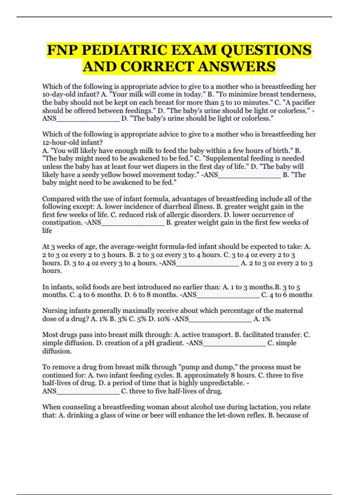 FNP PEDIATRIC EXAM QUESTIONS AND CORRECT ANSWERS Which of the following is appropriate advice to give to a mother who is breastfeeding her 10-day-old infant? A. "Your milk will come in today." B. "To minimize breast tenderness, the baby should not be kept on each breast for more than 5 to 10 minutes." C. "A pacifier should be offered between feedings." D. "The baby's urine should be light or colorless." -ANS______________ D. "The baby's urine should be light or colorless." Which of the following is appropriate advice to give to a mother who is breastfeeding her 12-hour-old infant? A. "You will likely have enough milk to feed the baby within a few hours of birth." B. "The baby might need to be awakened to be fed." C. "Supplemental feeding is needed unless the baby has at least four wet diapers in the first day of life." D. "The baby will likely have a seedy yellow bowel movement today." -ANS______________ B. "The baby might need to be awakened to be fed."