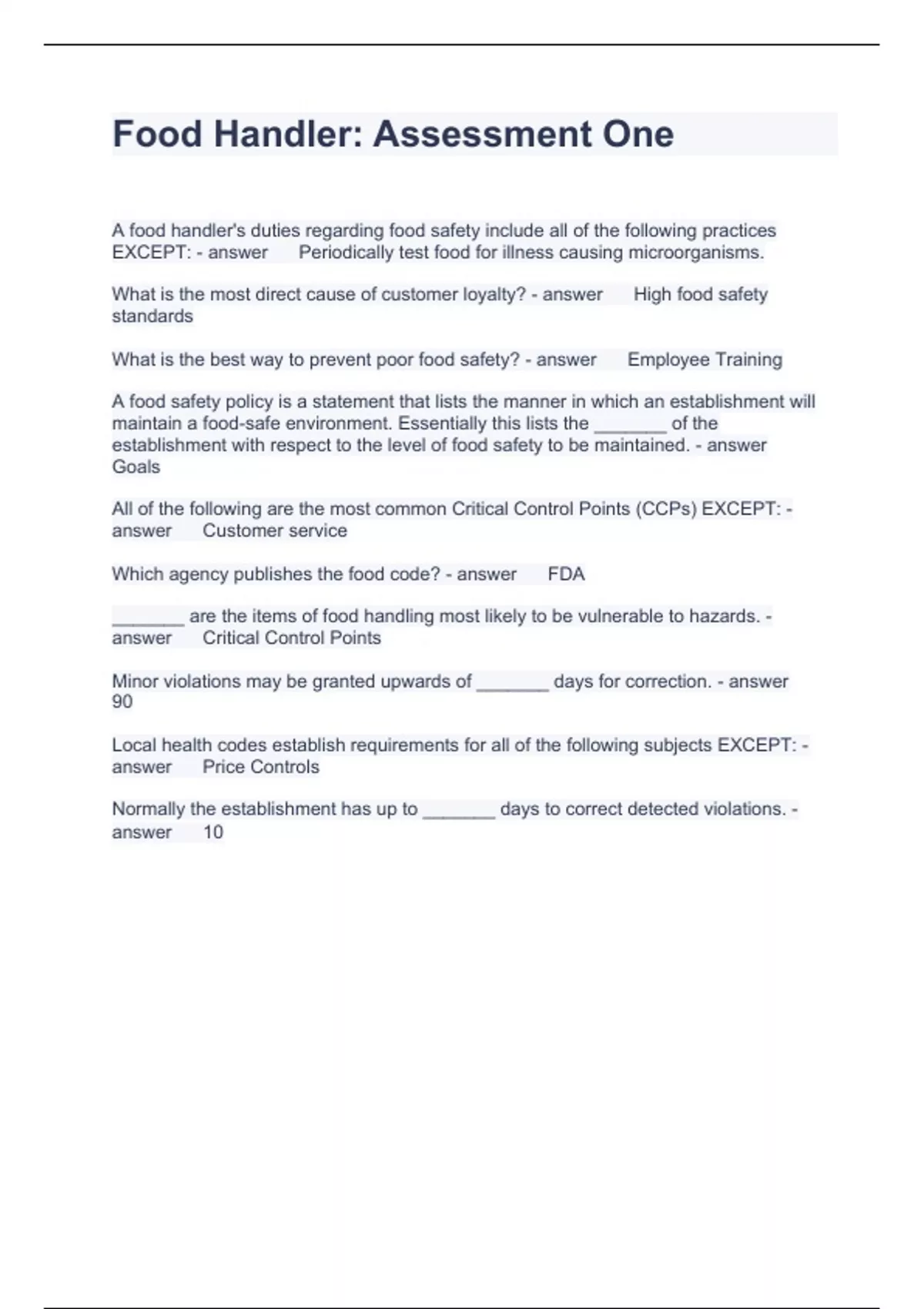 Exam of 1 pages for the course food handlers at food handlers (Food Handler 1)