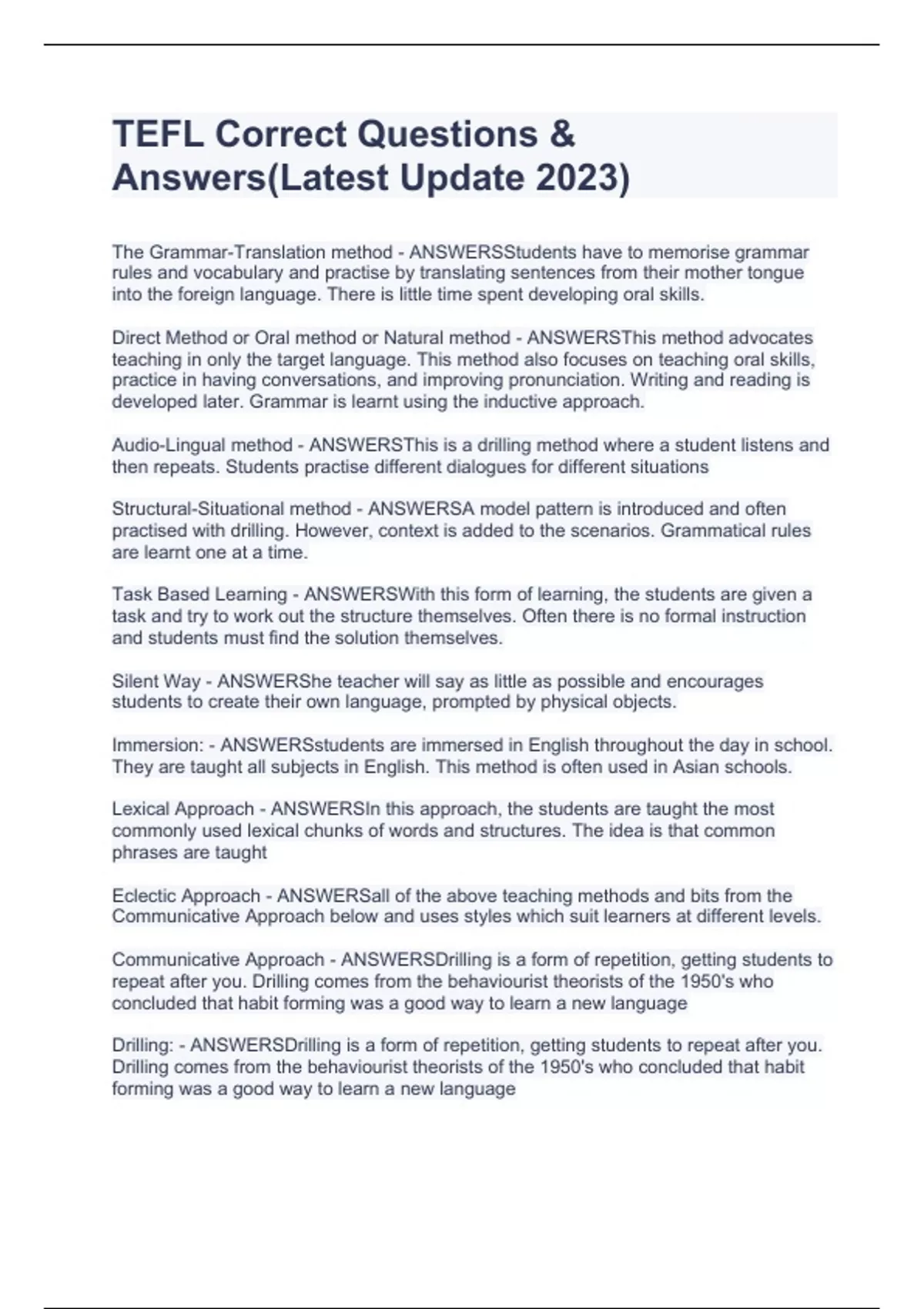 TEFL Correct Questions & Answers(Latest Update 2023)