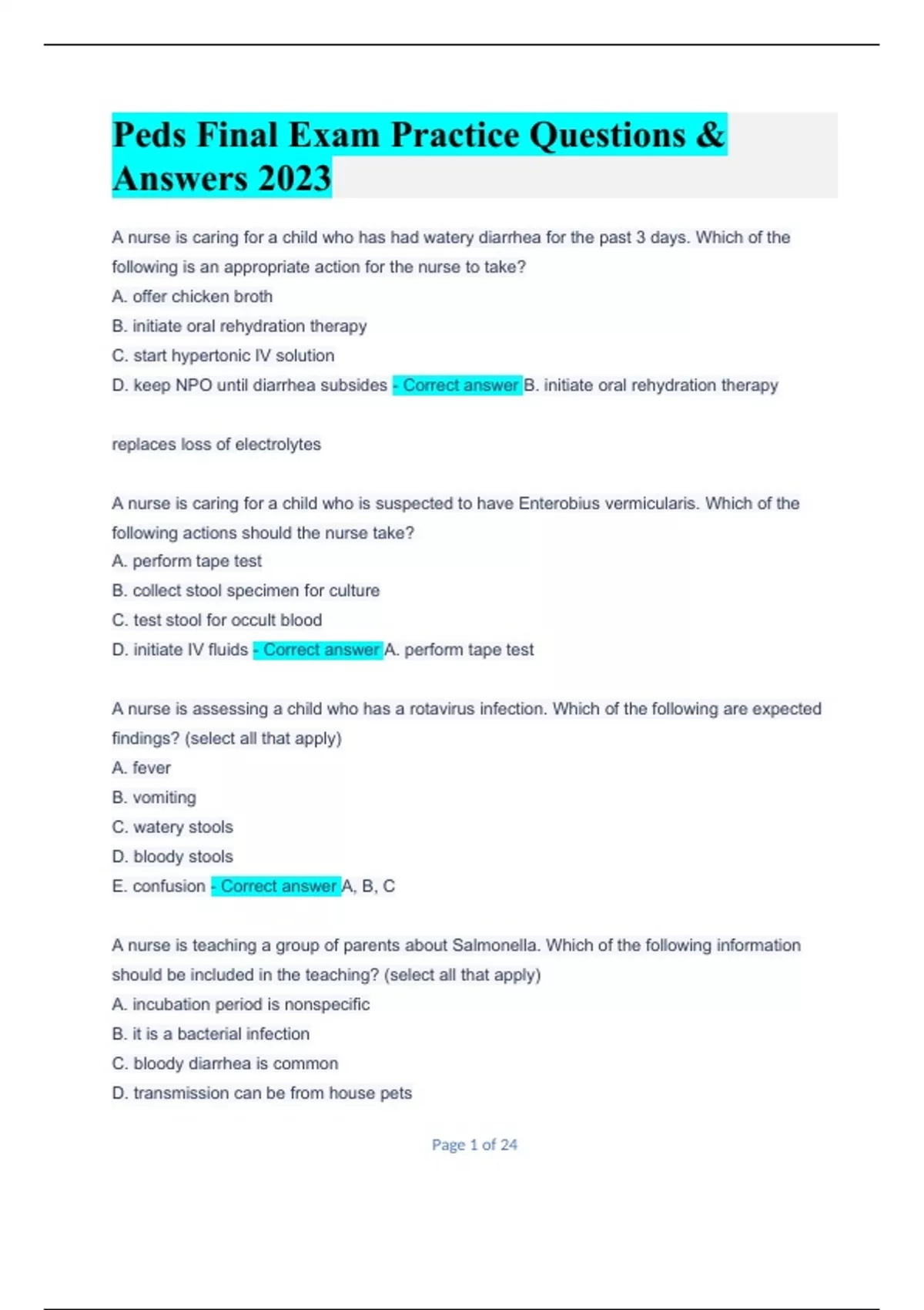 Peds Final Exam Practice Questions & Answers 2023Peds Final Exam Practice Questions & Answers 2023