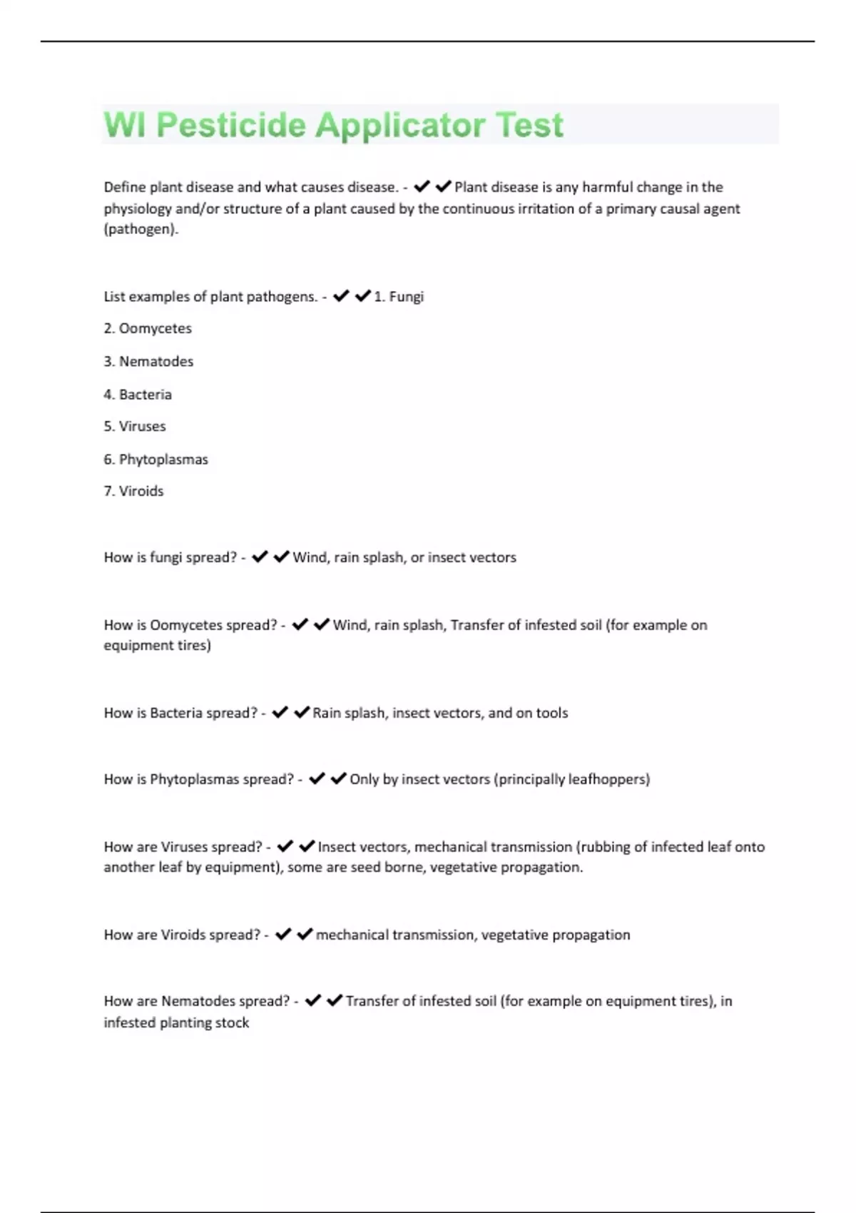 Define plant disease and what causes disease. - Plant disease is any harmful change in the physiology and/or structure of a plant caused by the continuous irritation of a primary causal agent (pathogen). List examples of plant pathogens. - 1. Fungi 2. Oomycetes 3. Nematodes 4. Bacteria 5. Viruses 6. Phytoplasmas 7. Viroids How is fungi spread? - Wind, rain splash, or insect vectors How is Oomycetes spread? - Wind, rain splash, Transfer of infested soil (for example on equipment tires) How is Bacteria spread? - Rain splash, insect vectors, and on tools How is Phytoplasmas spread? - Only by insect vectors (principally leafhoppers) How are Viruses spread? - Insect vectors, mechanical transmission (rubbing of infected leaf onto another leaf by equipment), some are seed borne, vegetative propagation. How are Viroids spread? - mechanical transmission, vegetative propagation How are Nematodes spread? - Transfer of infested soil (for example on equipment tires), in infested planting stockWhat are four prerequisites for plant disease to occur? - 1. A pathogen population capable of causing the disease. 2. A host that is susceptible to infection by that pathogen population. 3. Environmental conditions that favor disease development. 4. Sufficient time for disease to actually develop. What are clues that help you determine whether a problem is caused by an abiotic agent (non living thing) or a pathogen (living thing)? - Caused by an abiotic agent if... 1. The problem appears suddenly 2. The problem is in a uniform pattern 3. More than one plant species is affected Caused by a pathogen if... 1. The problem starts small and gradually increases in size and severity over a period of several days. 2. Observe a gradual cange from healthy to dead or damaged areas. 3. Randomly distributed in the field. 4. Disease affects only one plant species. List examples of abiotic agents that induce plant injury. - 1. Temperature extremes 2. Soil moisture extremes 3. Reduced oxygen levels 4. Unfavorable light conditions 5. Naturally occurring toxic chemicals 6. Salt 7. Soil compaction 8. Deficiency, excess, or imbalance of soil nutrients 9. Pollutants 10. Frost11. Lightning, hail, and wind 12. Phytotoxic spray mixtures 13. Nitrogen burn 14. Pollutants What factors contribute to the need for chemical control? - 1. Other control practices are unavailable or inadequate. 2. The plant has high aesthetic value or its use allows little tolerance for disease. 3. Quality is reduced by even a low level of disease. 4. A sudden and unexpected disease outbreak occurs.