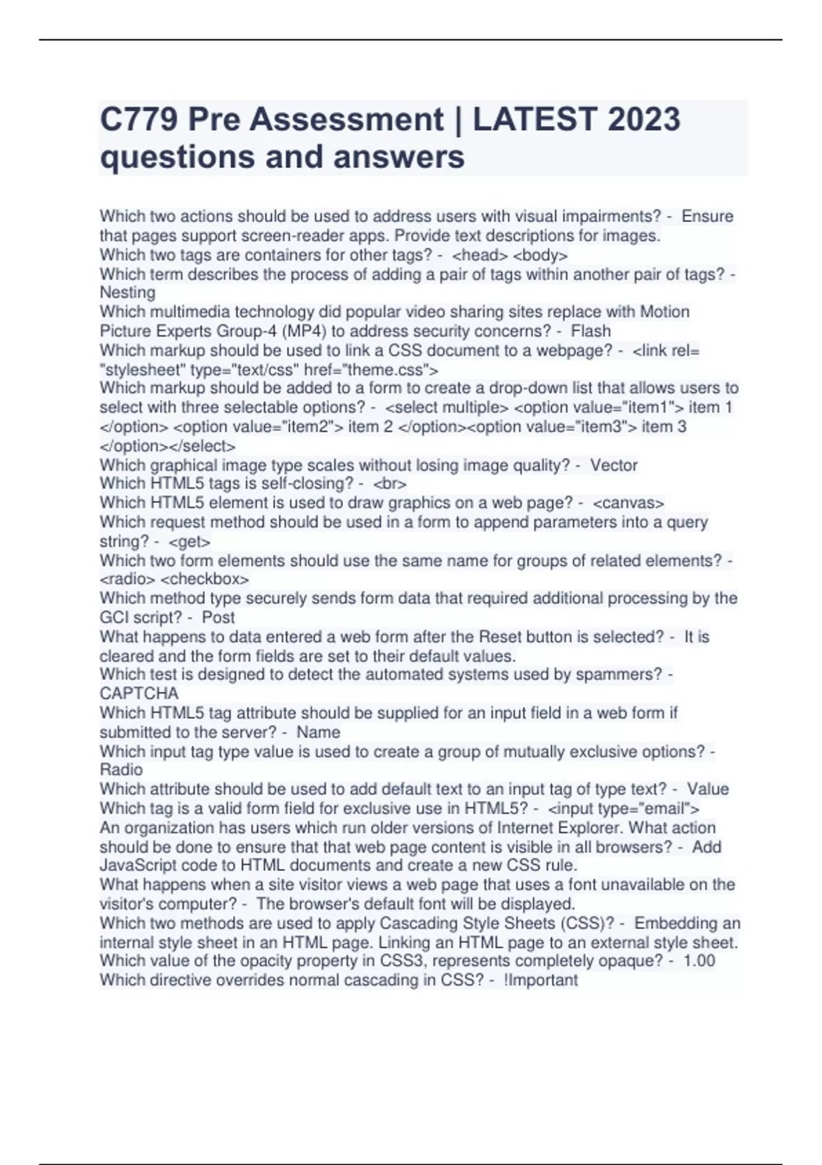 C779 Pre Assessment | LATEST 2023 questions and answers Which two actions should be used to address users with visual impairments? - Ensure that pages support screen-reader apps. Provide text descriptions for images. Which two tags are containers for other tags? - <head> <body> Which term describes the process of adding a pair of tags within another pair of tags? - Nesting Which multimedia technology did popular video sharing sites replace with Motion Picture Experts Group-4 (MP4) to address security concerns? - Flash Which markup should be used to link a CSS document to a webpage? - <link rel= "stylesheet" type="text/css" href=""> Which markup should be added to a form to create a drop-down list that allows users to select with three selectable options? - <select multiple> <option value="item1"> item 1 </option> <option value="item2"> item 2 </option><option value="item3"> item 3 </option></select> Which graphical image type scales without losing image quality? - Vector Which HTML5 tags is self-closing? - <br> Which HTML5 element is used to draw graphics on a web page? - <canvas> Which request method should be used in a form to append parameters into a query string? - <get> Which two form elements should use the same name for groups of related elements? - <radio> <checkbox> Which method type securely sends form data that required additional processing by the GCI script? - Post What happens to data entered a web form after the Reset button is selected? - It is cleared and the form fields are set to their default values. Which test is designed to detect the automated systems used by spammers? - CAPTCHA Which HTML5 tag attribute should be supplied for an input field in a web form if submitted to the server? - Name Which input tag type value is used to create a group of mutually exclusive options? - Radio Which attribute should be used to add default text to an input tag of type text? - Value Which tag is a valid form field for exclusive use in HTML5? - <input type="email"> An organization has users which run older versions of Internet Explorer. What action should be done to ensure that that web page content is visible in all browsers? - Add JavaScript code to HTML documents and create a new CSS rule. What happens when a site visitor views a web page that uses a font unavailable on the visitor's computer? - The browser's default font will be displayed. Which two methods are used to apply Cascading Style Sheets (CSS)? - Embedding an internal style sheet in an HTML page. Linking an HTML page to an external style sheet. Which value of the opacity property in CSS3, represents completely opaque? - 1.00 Which directive overrides normal cascading in CSS? - !Important What are Syntactically Awesome Sheets (SASS) used for with regard to adding functionality? - As a CSS extension language for preprocessing. Given the following CSS: p{color: red;} p{color: yellow;} p{color: green;}