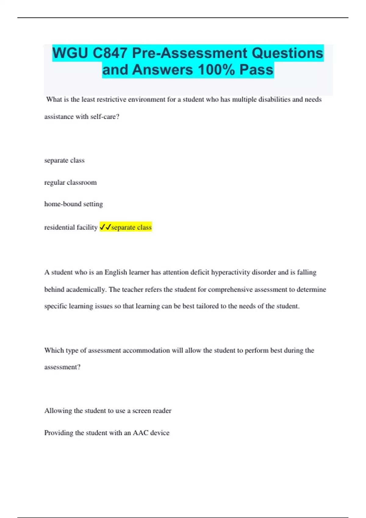 WGU C847 Pre-Assessment Questions and Answers 100% Pass What is the least restrictive environment for a student who has multiple disabilities and needs assistance with self-care? separate class regular classroom home-bound setting residential facility separate class A student who is an English learner has attention deficit hyperactivity disorder and is falling behind academically. The teacher refers the student for comprehensive assessment to determine specific learning issues so that learning can be best tailored to the needs of the student. Which type of assessment accommodation will allow the student to perform best during the assessment? Allowing the student to use a screen reader Providing the student with an AAC device Allowing the student to use a spelling device Scheduling frequent breaks during the assessment Scheduling frequent breaks during the assessment A student with a disability struggles to read standard print. Which type of assessment accommodation will best support this student? timing setting scheduling presentation presentation Which instructional service delivery model outside of the regular classroom is considered least restrictive for students with disabilities? resource room special day school self-contained classroom specialized residential school resource room Where do the majority of students with disabilities receive the majority of their educational services? resource rooms separate schools regular classrooms separate classrooms regular classrooms What is the least restrictive environment for a second-grader student with minimal behavior challenges who needs assistance with reading fluency? Resource room Separate class Separate school residential facility resource room How frequently must the Individualized Education Program (IEP) be reviewed according to the Individuals with Disabilities Education Act (IDEA)? every month every 3 months every 6 months every 12 months every 12 months What's an IEP? Individualized Education Program Which information must be included in an Individual Education Plan (IEP)? The student's level of participation in a work environment The student's level of participation in extracurricular