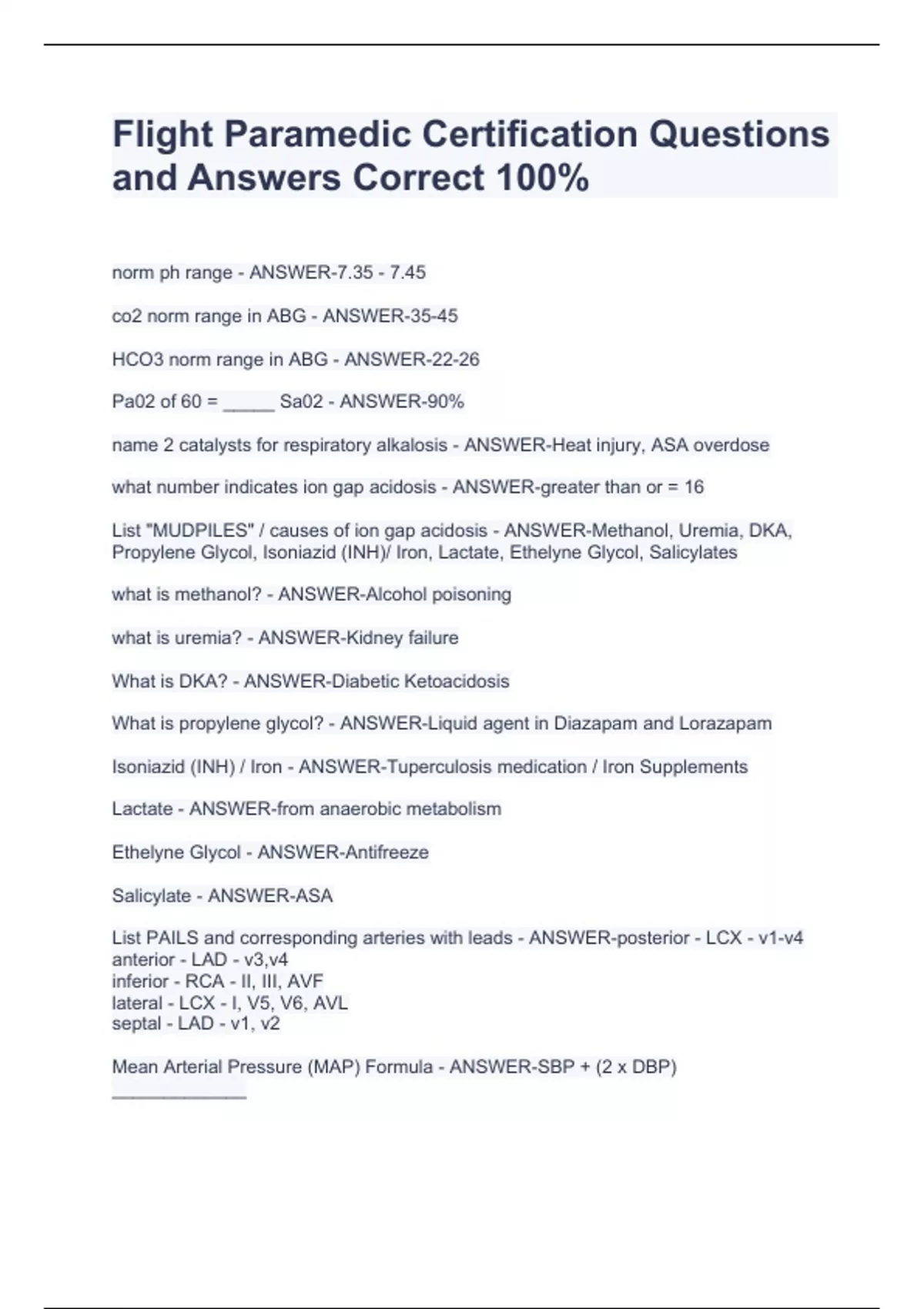 Flight Paramedic Certification Questions and Answers Correct 100%