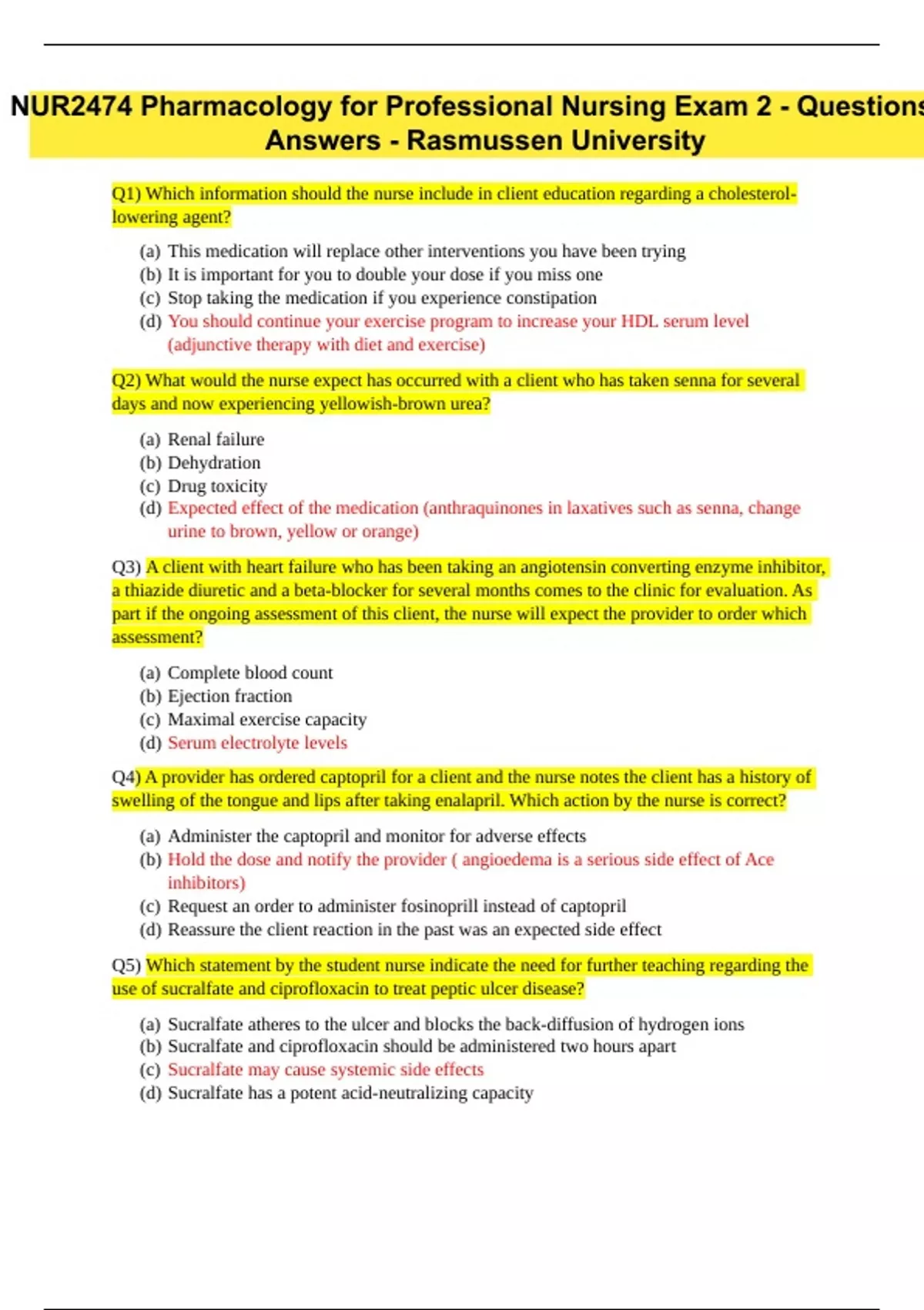 NUR2474 Pharmacology for Professional Nursing Exam 2 - Questions & Answers - Rasmussen University