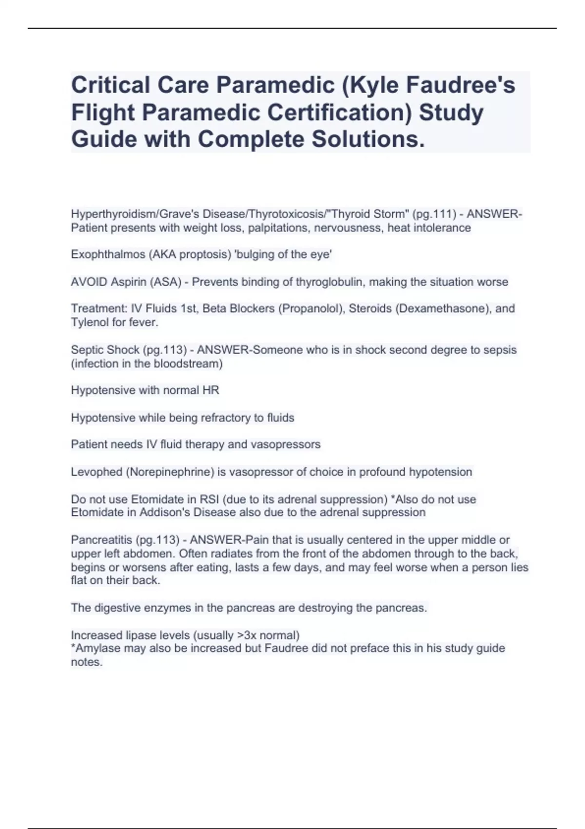 Hyperthyroidism/Grave's Disease/Thyrotoxicosis/"Thyroid Storm" (pg.111) - ANSWER-Patient presents with weight loss, palpitations, nervousness, heat intolerance Exophthalmos (AKA proptosis) 'bulging of the eye' AVOID Aspirin (ASA) - Prevents binding of thyroglobulin, making the situation worse Treatment: IV Fluids 1st, Beta Blockers (Propanolol), Steroids (Dexamethasone), and Tylenol for fever. Septic Shock (pg.113) - ANSWER-Someone who is in shock second degree to sepsis (infection in the bloodstream) Hypotensive with normal HR Hypotensive while being refractory to fluids Patient needs IV fluid therapy and vasopressors Levophed (Norepinephrine) is vasopressor of choice in profound hypotension Do not use Etomidate in RSI (due to its adrenal suppression) *Also do not use Etomidate in Addison's Disease also due to the adrenal suppression Pancreatitis (pg.113) - ANSWER-Pain that is usually centered in the upper middle or upper left abdomen. Often radiates from the front of the abdomen through to the back, begins or worsens after eating, lasts a few days, and may feel worse when a person lies flat on their back.