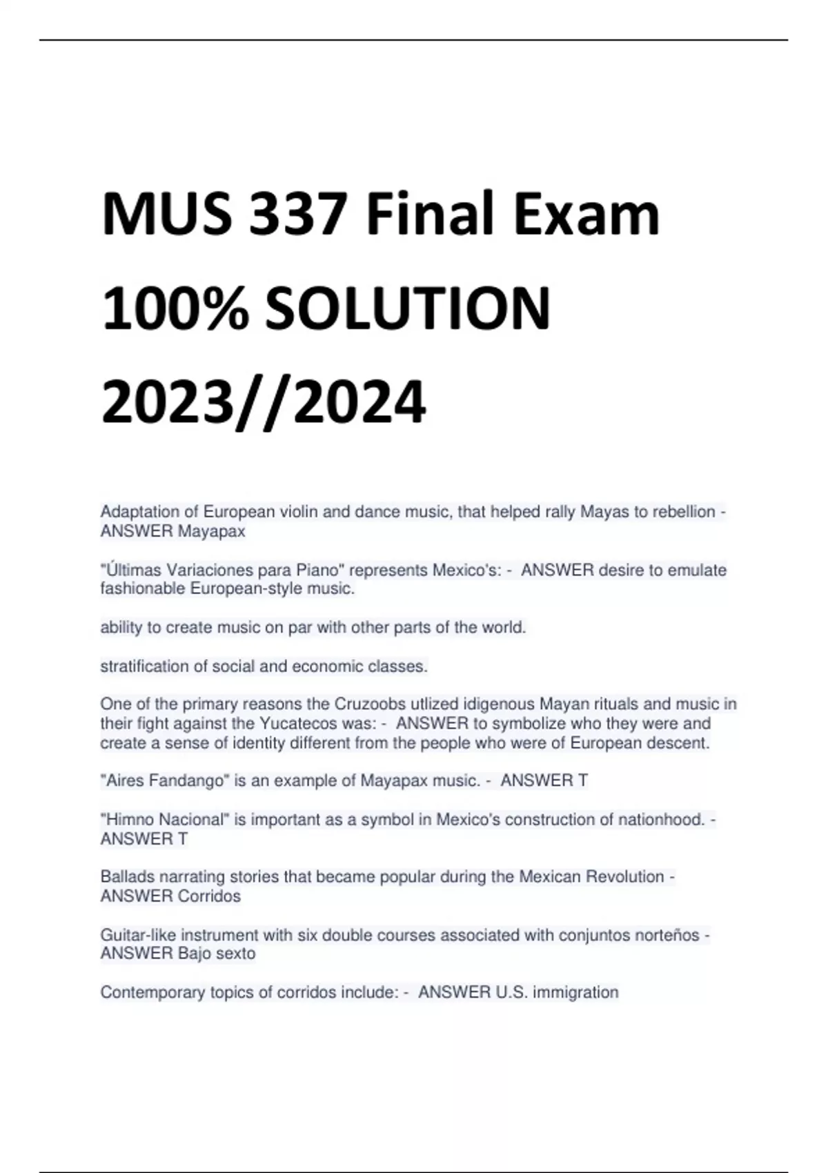 MUS 337 Final Exam 100% SOLUTION 2023//2024 Adaptation of European violin and dance music, that helped rally Mayas to rebellion - ANSWER Mayapax "Últimas Variaciones para Piano" represents Mexico's: - ANSWER desire to emulate fashionable European-style music. ability to create music on par with other parts of the world. stratification of social and economic classes. One of the primary reasons the Cruzoobs utlized idigenous Mayan rituals and music in their fight against the Yucatecos was: - ANSWER to symbolize who they were and create a sense of identity different from the people who were of European descent. "Aires Fandango" is an example of Mayapax music. - ANSWER T "Himno Nacional" is important as a symbol in Mexico's construction of nationhood. - ANSWER T Ballads narrating stories that became popular during the Mexican Revolution - ANSWER Corridos Guitar-like instrument with six double courses associated with conjuntos norteños - ANSWER Bajo sexto Contemporary topics of corridos include: - ANSWER U.S. immigration Mexican work ethic Drug trafficking Los Tigres del Norte use doble sentido (double meaning) in their lyrics in order to "cover their tracks" when talking about sensitive information, a common tactic in songwriting throughout time and history. - ANSWER T To be successful, corridos should tell a true story, almost like a musical newspaper. - ANSWER T Soundtracks of golden-era films in Mexico helped create iconic cultural heros, such as the singing cowboy, and promoted musical forms like the: - ANSWER Canción ranchera Mexican bolero Corrido In the 1930s, radio personality ____________________, composed many romantic songs of international fame, and captured the hearts of Mexican listeners, especially housewives, in their homes. - ANSWER Agustin Lara Singer-actor who became the idealized representative of the handsome, heroic rancher. - ANSWER Jorge Negrete The 19th-century Cuban dance form that later developed in Mexico. - ANSWER Bolero Danzón The most popular genre of Mexican film, which took its cues from revistas, zarzuelas, and comedias teatrales. - ANSWER Comedia Ranchera Emilio "El Indio" Fernández is regarded by many as the greatest of the Mexican cinema directors of the golden era. - ANSWER T Silent films in Mexico began in the mid- to late-1920s. - ANSWER F This song, released in 1974 by Los Tigres del Norte, came to define the narcocorrido genre and earned the band fame on both sides of Mexico-U.S. border. - ANSWER Contrabando y traición Identify the popular musical genre that is NOT typically identified with wedding celebrations in Mexico. - ANSWER Jácara This musical movement took off in the 1970s and reflected the acceptance of the cumbia as the ultimate Latin dance rhythm. - ANSWER La onda grupera The song "El triste," sung by José José, exemplifies the polished balada song style popular in the 1970s. - ANSWER T The cuatro is a guitar-like instrument with six double courses mostly associated with conjuntos norteños - ANSWER F Conjunto and banda may be considered two major fundamental styles in Mexican popular music. - ANSWER T Modern popular styles built around the cumbia dance rhythm, include quebradita and the techno genre known as tribal. - ANSWER T Silvestre Rivueltas - ANSWER Represented post-revolutionary sentiment in music drawing upon urban and popular musics El renacuajo paseador José Pablo Moncayo - ANSWER Represented nationalism in music drawing from local sounds and musics Huapango Manuel Enríquez - ANSWER Represented post-nationalistic music using unidentifiable sounds and experimentation Ritual Mario Lavista - ANSWER Infuses literary and philosphical thought into music asking how sound itself is musical Clepsidra Marcela Rodríguez - ANSWER Bridges artistic endeavors between drama and music and highlights female characters and musicians in compositions