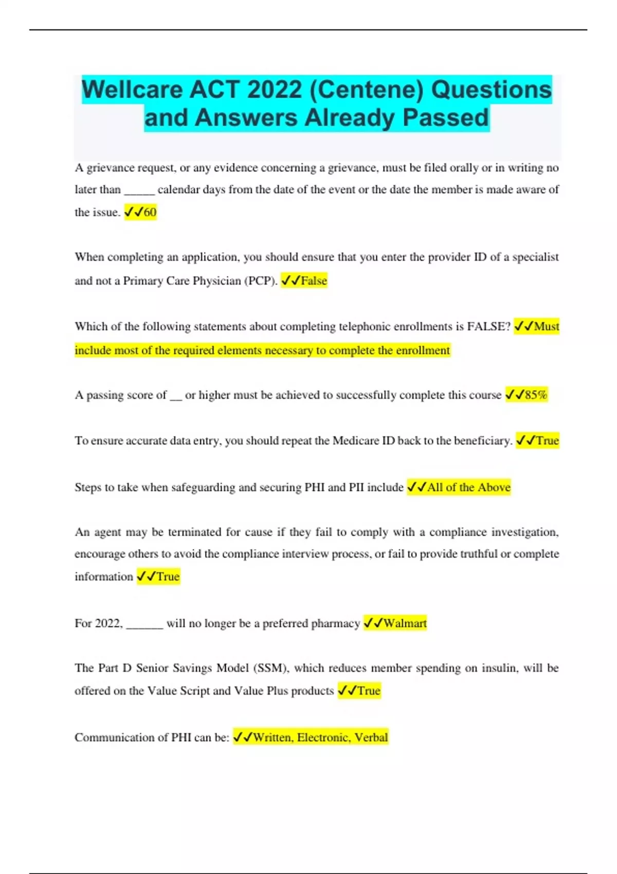 Wellcare ACT 2023 (Centene) Questions and Answers Already Passed