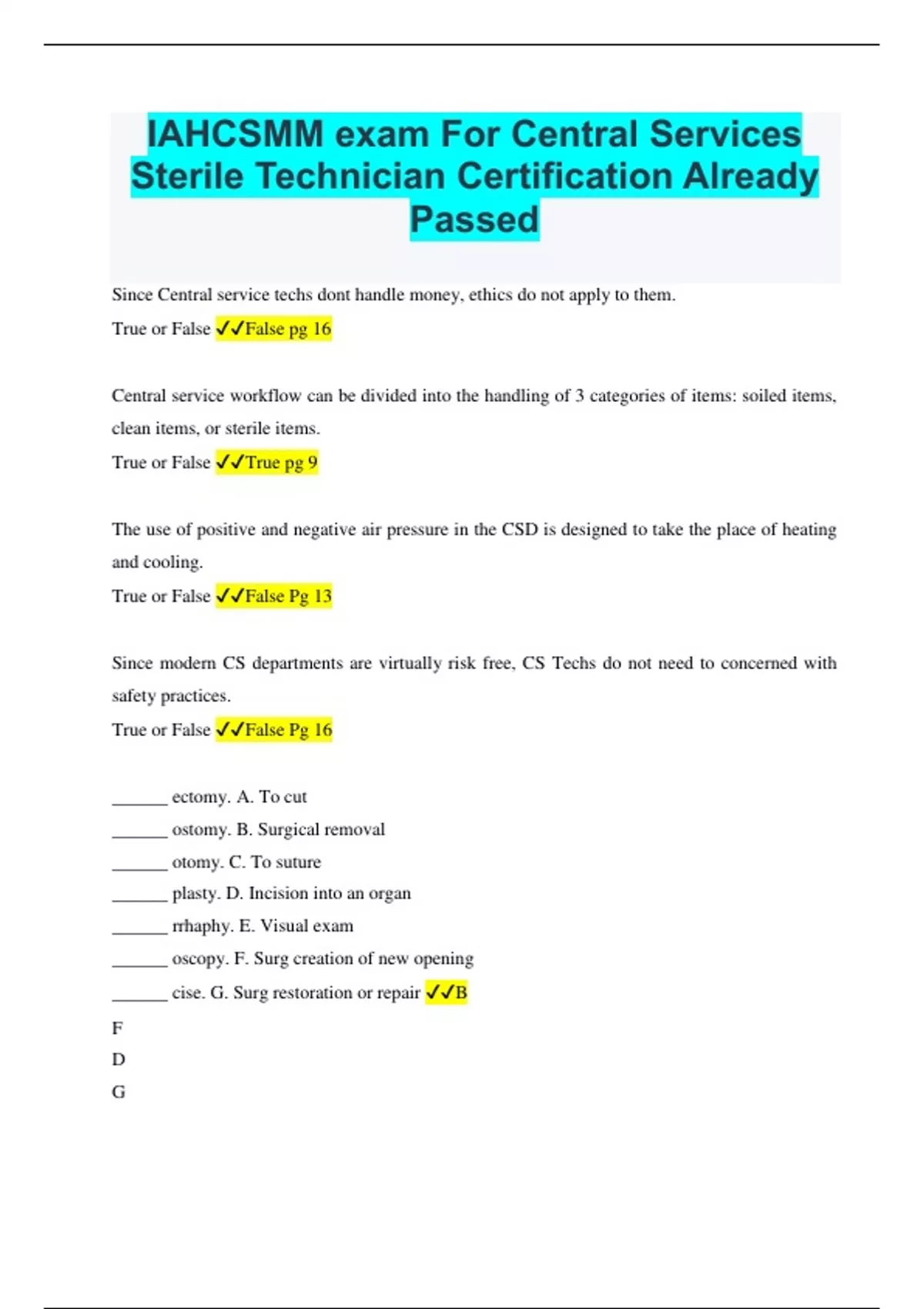 IAHCSMM exam For Central Services Sterile Technician Certification Already Passed Since Central service techs dont handle money, ethics do not apply to them. True or False False pg 16 Central service workflow can be divided into the handling of 3 categories of items: soiled items, clean items, or sterile items. True or False True pg 9 The use of positive and negative air pressure in the CSD is designed to take the place of heating and cooling. True or False False Pg 13 Since modern CS departments are virtually risk free, CS Techs do not need to concerned with safety practices. True or False False Pg 16 ______ ectomy. A. To cut ______ ostomy. B. Surgical removal ______ otomy. C. To suture ______ plasty. D. Incision into an organ ______ rrhaphy. E. Visual exam ______ oscopy. F. Surg creation of new opening ______ cise. G. Surg restoration or repair B F D G C E A This organ pumps blood throughout the body Heart The process by which cartilage is replaced by bone Ossification Any place where two bones meet Joint The main control unit of the CNS Brain. Pg